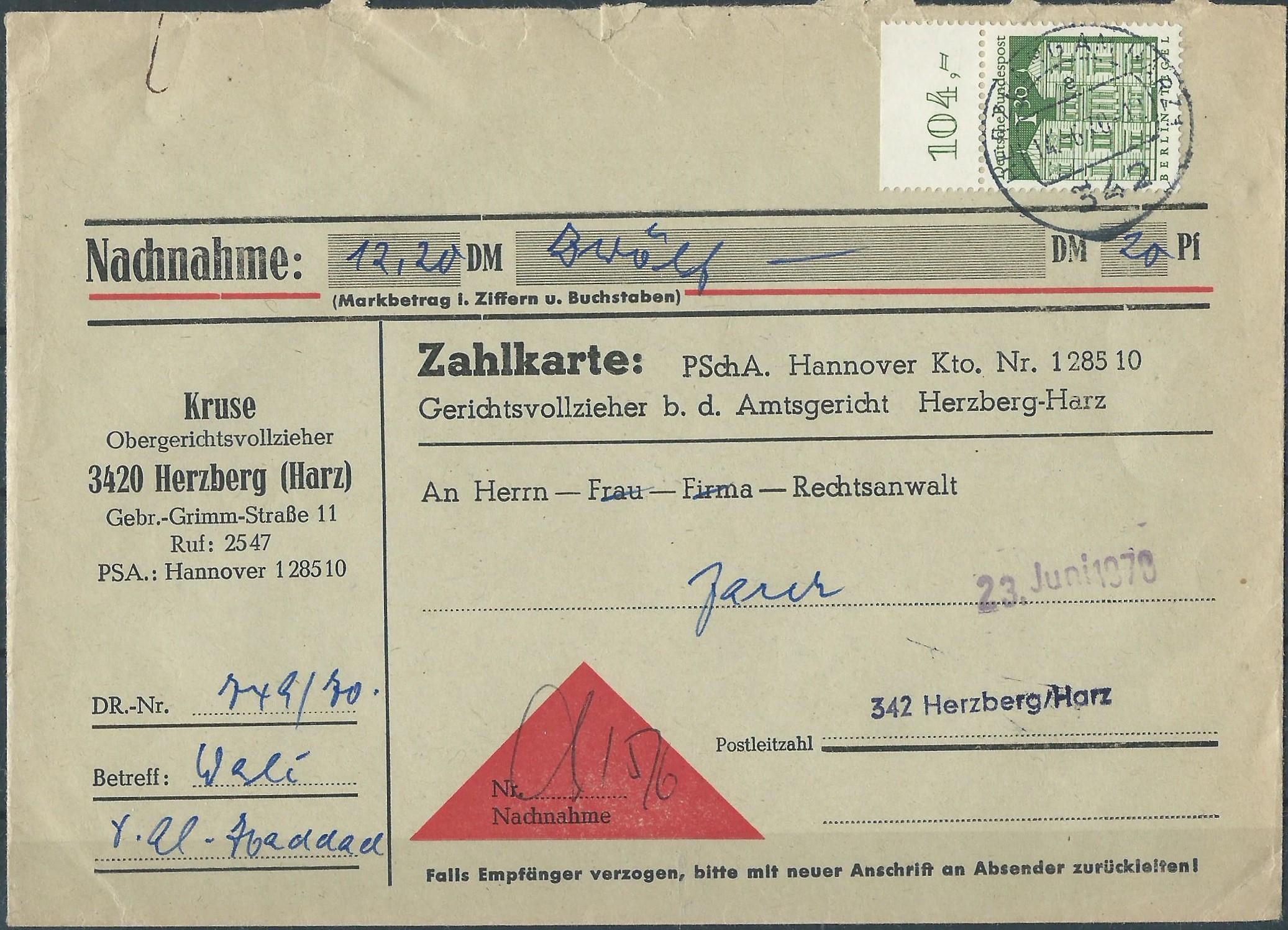 gerade eben ist mir eine Nachnahme-Sendung in die Hände gefallen, die hier natürlich gleich gezeigt werden soll. Hier hat ein Gerichtsvollzieher einem Rechtsanwalt einen ausgeführten Auftrag zurück geschickt und gleich seine Kosten eingezogen. Der Beleg trägt ein Oberrandstück der grossen Bauwerke 1,30 DM und wurde am 14.6.70 in Harzberg gestempelt.