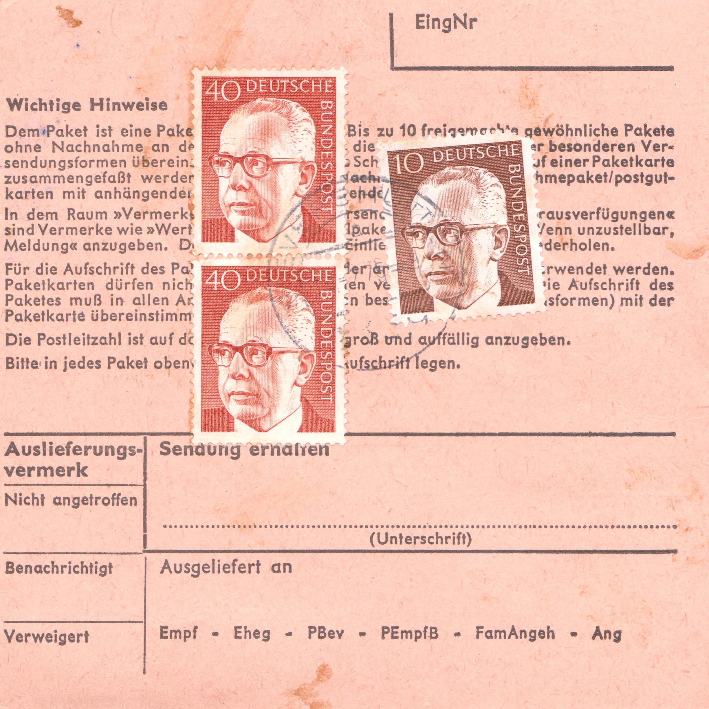 Paketkarte mit Mischfrankatur 2 DM, 3 x 40 Pf sowie 10 Pf zur Abdeckung der Portostufe von 3,30 DM für ein Paket mit einem Gewicht von 3 kg, aufgegeben in 2359 Sievershütten: