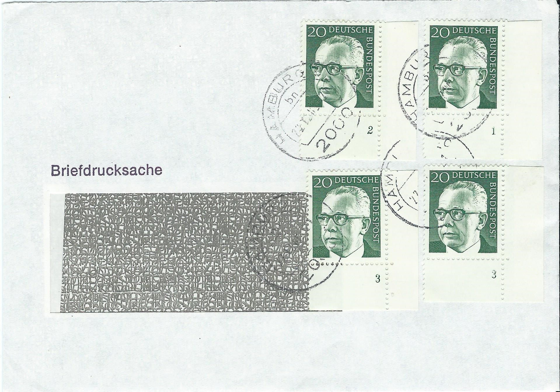 So, nun ist es passiert, mir ist die 10 Pf-Frankatur durchgerutscht. Die sollte eigentlich schon vorher rein, aber egal, kommt sie halt zum Schluss ;) Briefdrucksache mit Hildesheim-Maschinenstempel vom 2.4.71 und Formnummer 2: