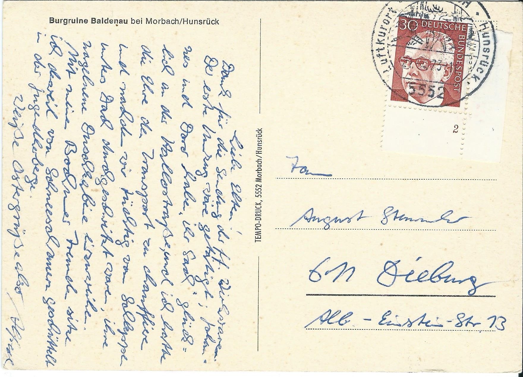 Dann eine rechte untere Bogenecke 30 Pf mit Formnummer 2 auf Postkarte, gestempelt 21.4.73 in Moorbach mit Ortswerbestempel: