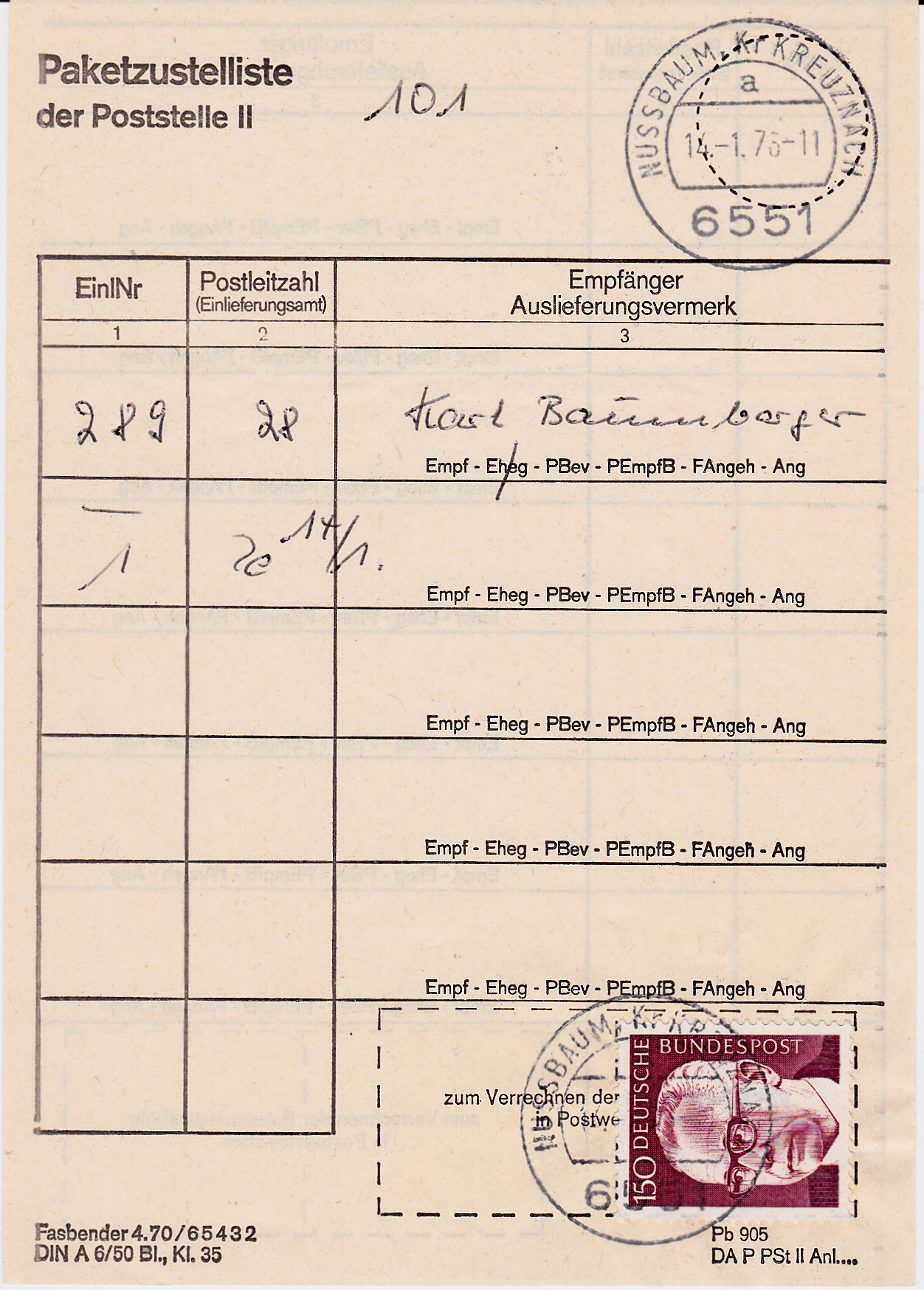 Eine weitere Paketzustellliste der Poststelle II in 6551 Nussbaum Kreis Kreuznach jetzt vom 14.1.1976 mit einer Marke zu 150Pf der DS Heinemann (MiNr 730) zur Verrechnung der Paketzustellgebühr in Höhe von 1,50 DM für ein Paket.