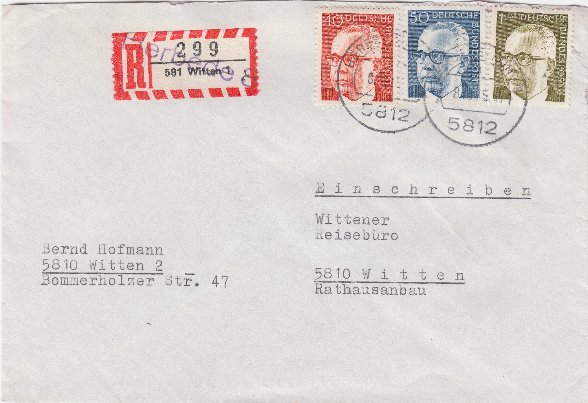 Hier als Beispiel ein Standardbrief (50 Pf) per Einschreiben (140 Pf), was die vom 01.07.1974 bis zum 31.12.1978 geltende Portostufe von 190 Pf ergibt, frankiert mit drei Werten der Dauerserie Heinemann: