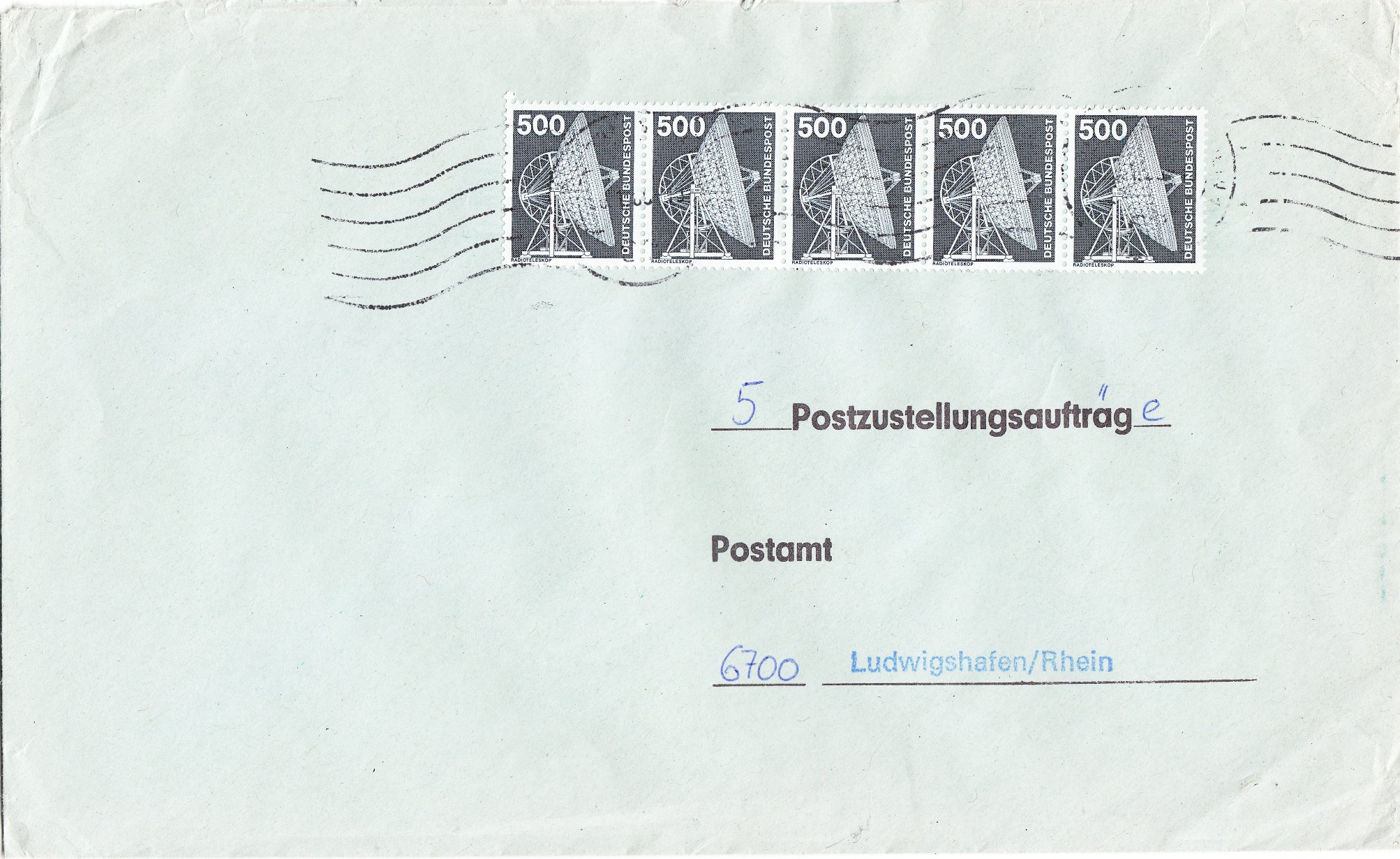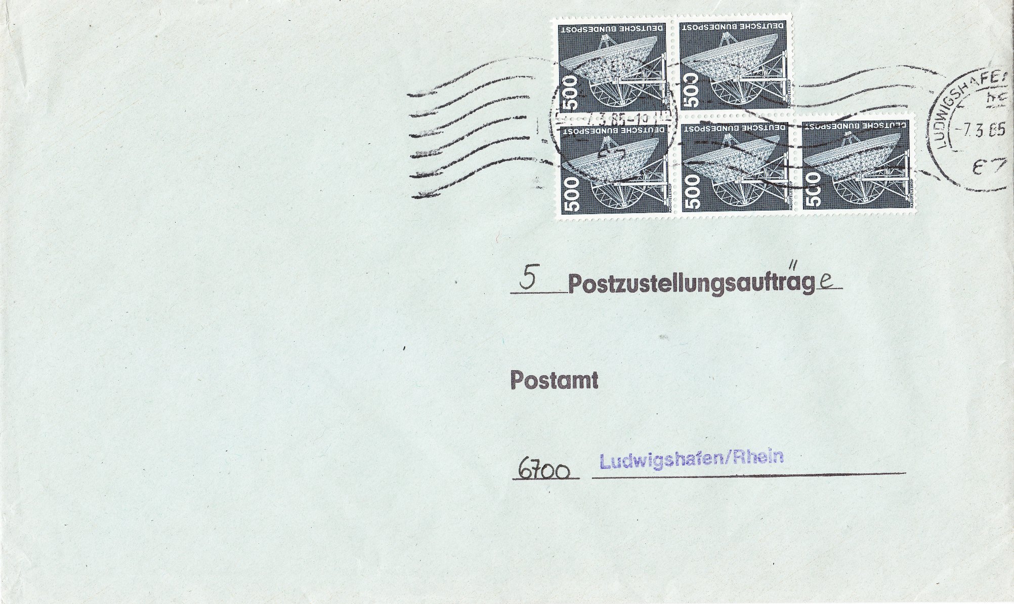 Mehrfachfrankatur von 5 Stück der Wertstufe 500 Pfennig am 07.03.1985 als Porto für "5 Postzustellungsaufträge":