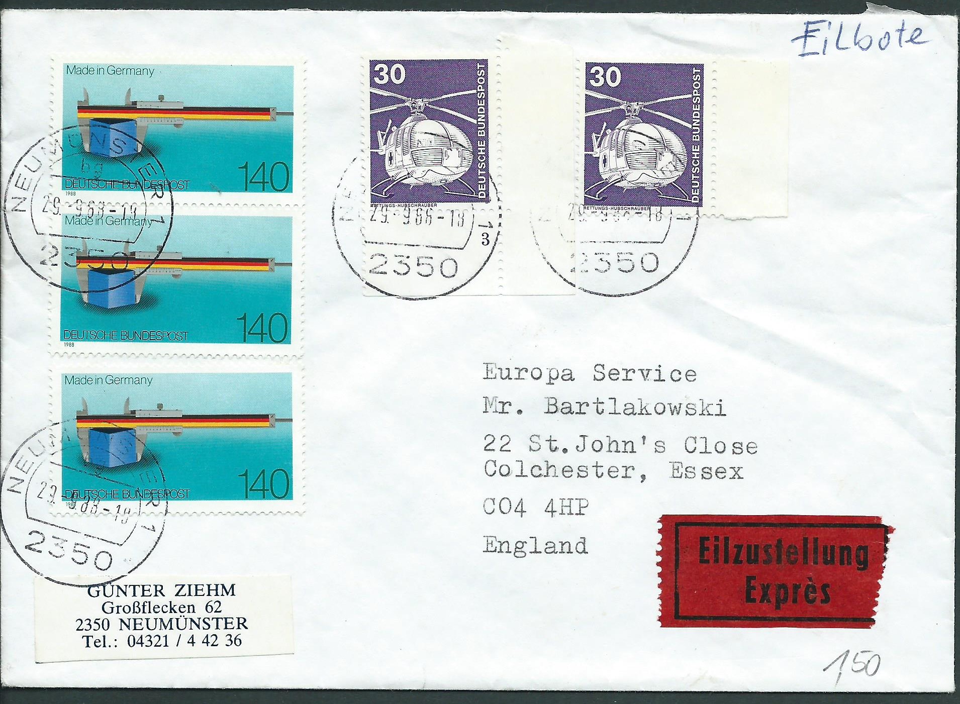 auf diesen Beleg haben sich 2 Marken der Mi.Nr. 849 (Industrie und Technik 30 Pf) verirrt. Eine davon ist aus der rechten unteren Bogenecke und hat die Formnummer 3, die 2. ist vom rechten Seitenrand. Dazu noch 3 Marken zu 1,40 DM der Mi.Nr. 1378 "100 Jahre Made in Germany". Das Ganze als Eilbrief nach England, gestempelt in Neumünster am 29.9.88.
