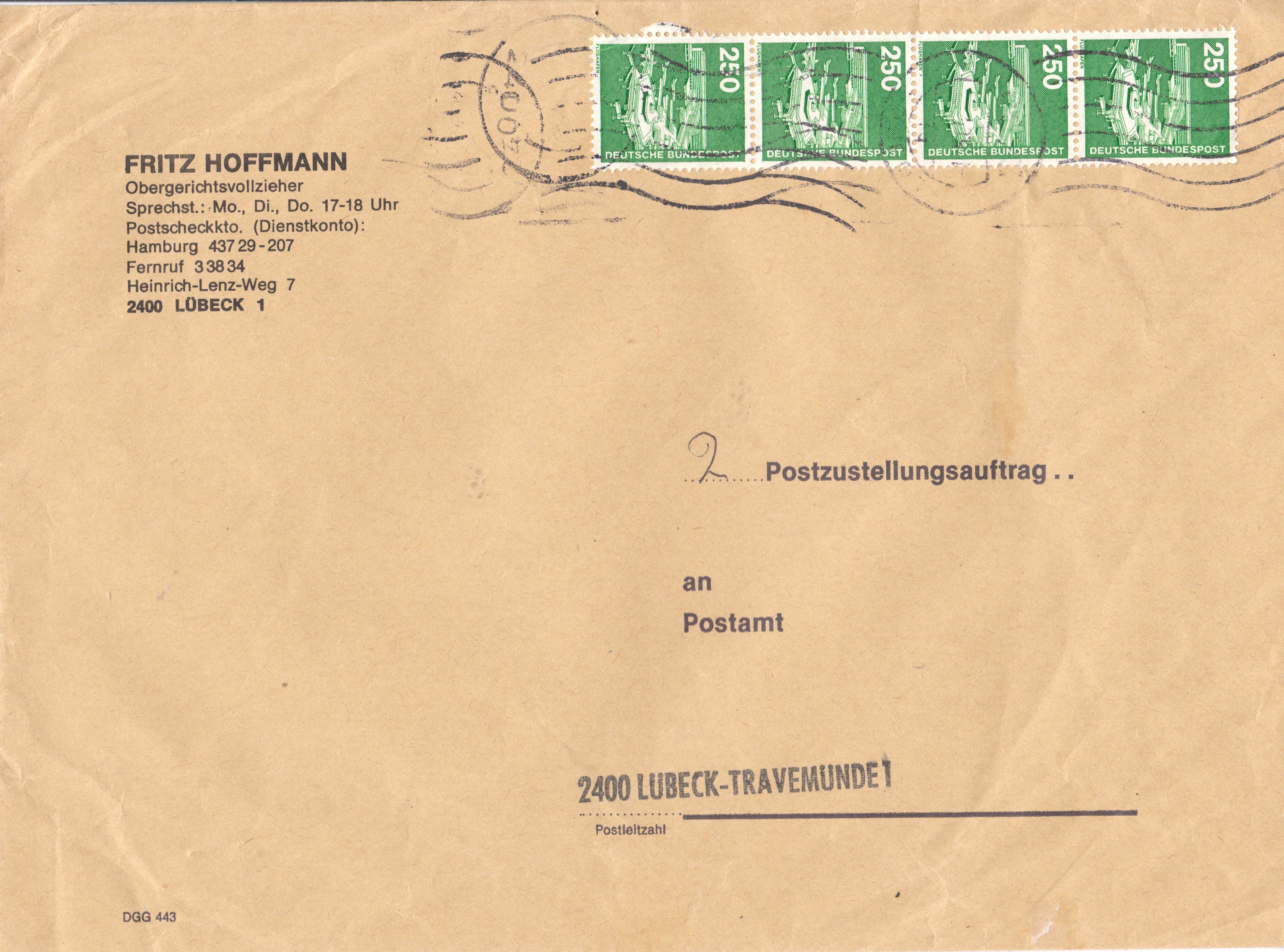 Mehrfachfrankatur von 4 Stück der Wertstufe 250 Pfennig als Porto für "2 Postzustellungsaufträge":