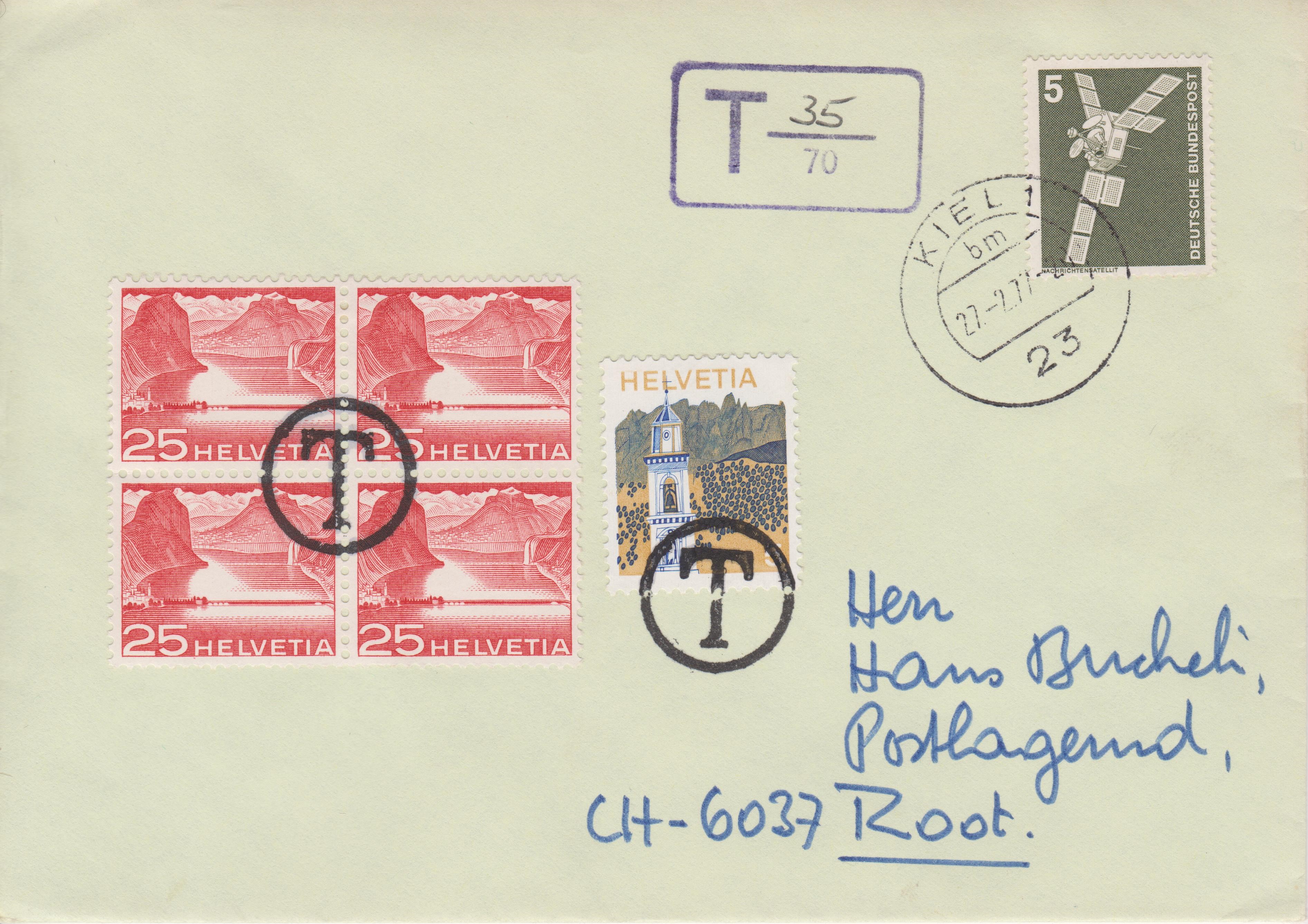Vorderseitig wurde 1 Schweizer Franken und 5 Rappen als vom Empfänger zu zahlendes Nachporto verklebt und per Stempel "T" entwertet.