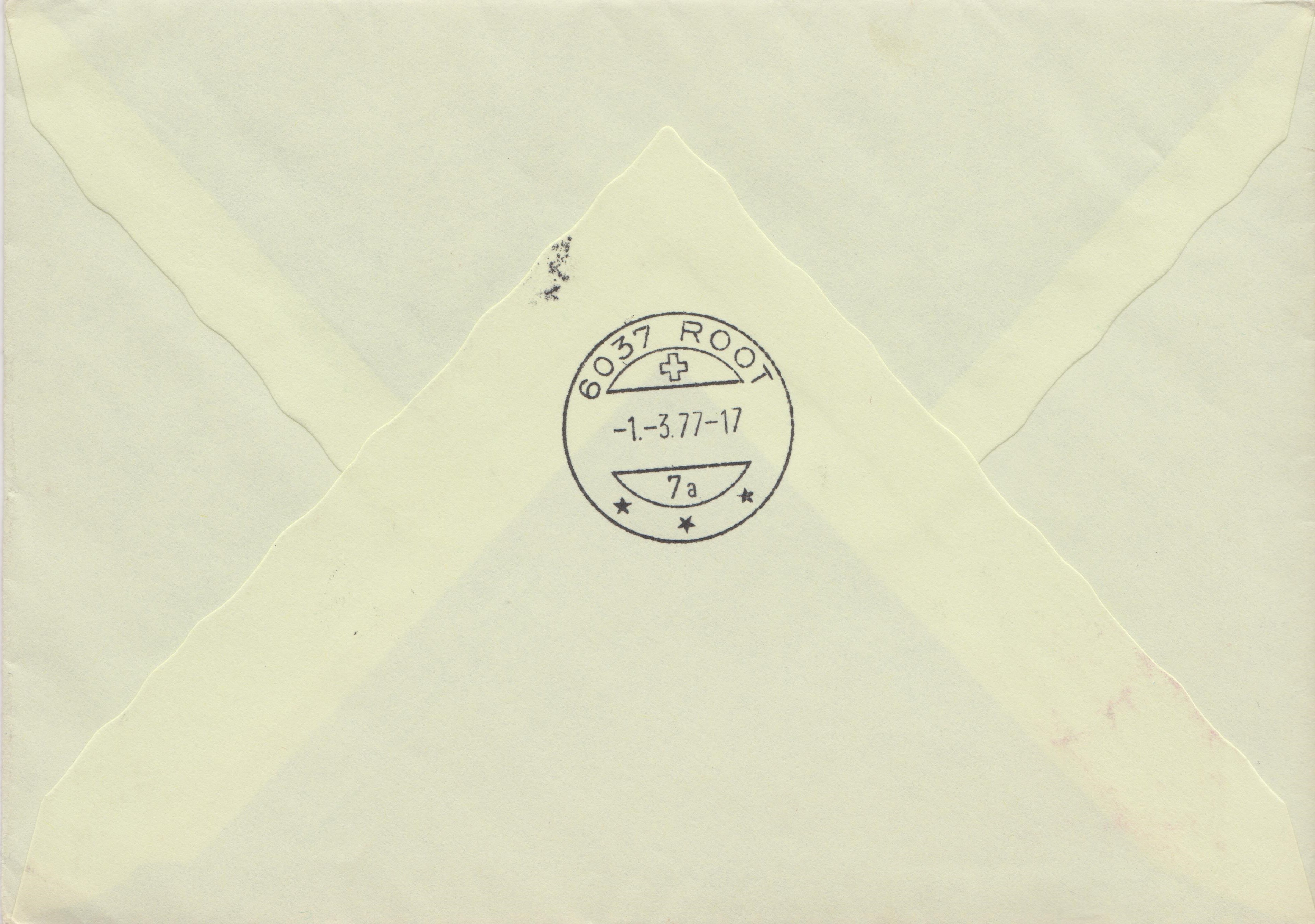 In 6037 ROOT in der Schweiz wurde am 01.03.1977 rückseitig ein Tagesstempel als Ankunftstempel abgeschlagen: