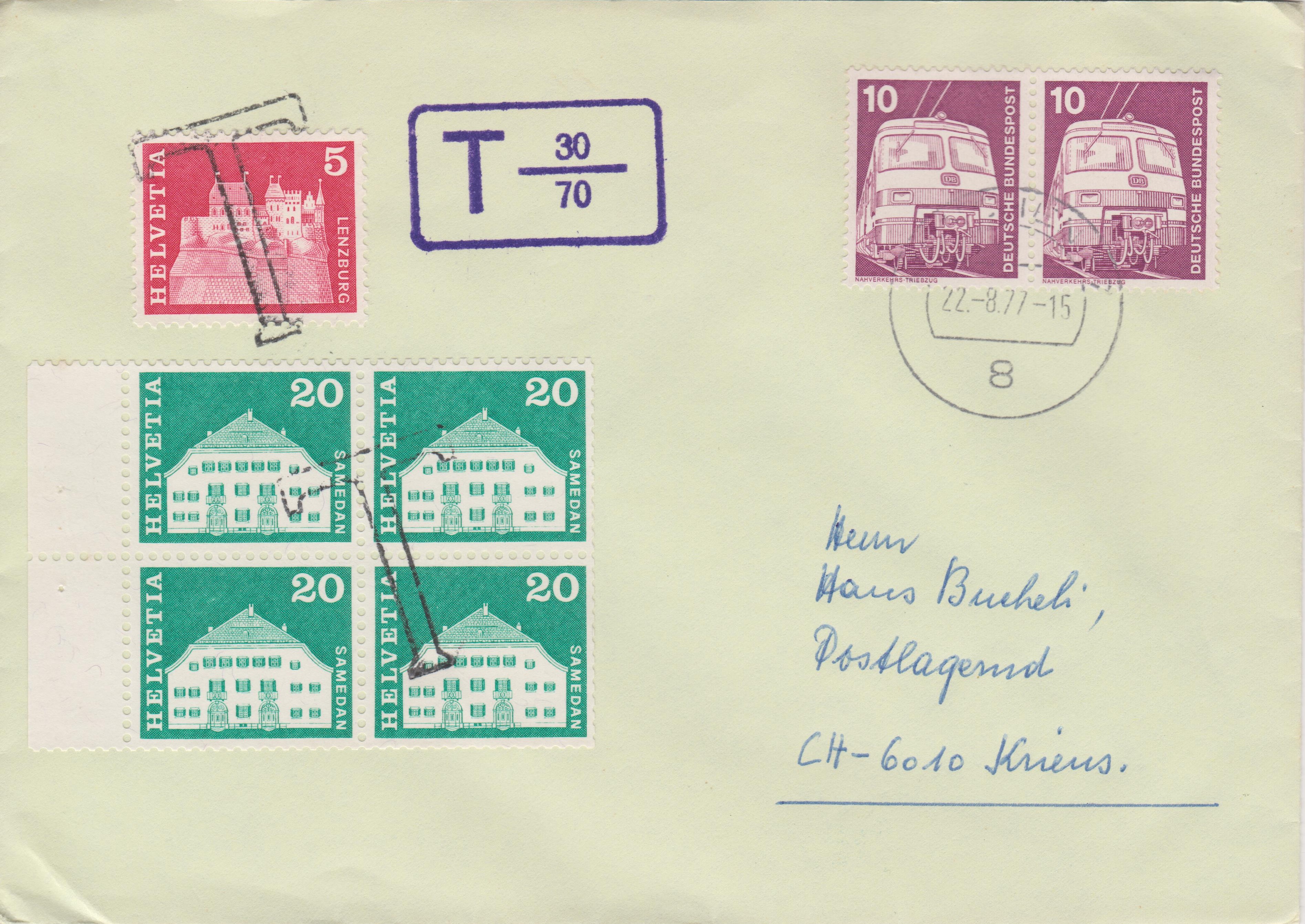 Für einen Standardbrief in die Schweiz galt am 22.08.1977 die Portostufe 50 Pf.