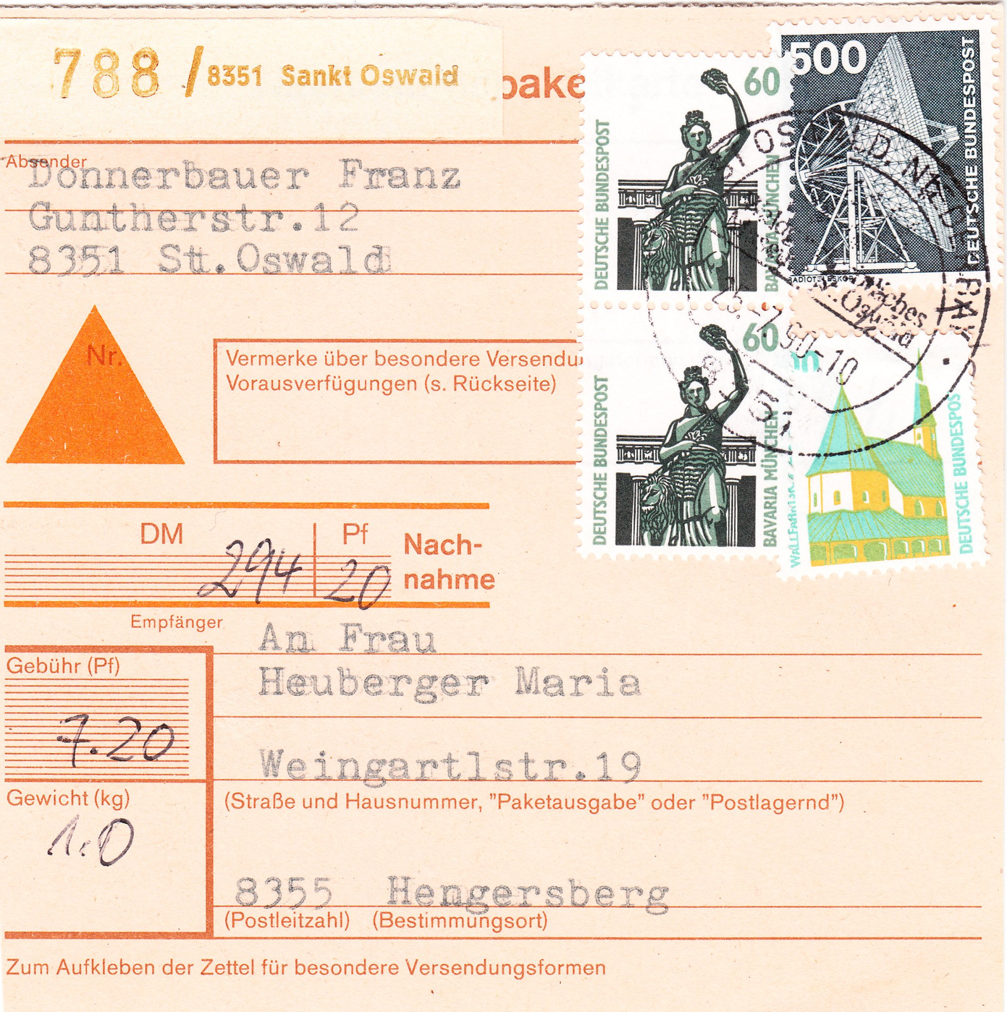 Fernbrief vom 26.10.1978 der Gewichtsstufe von 101 bis 250g, der in diesem Falle, wie bei Wertbriefen üblich, als tatsächlich "138 g" schwer dokumentiert wurde, Portostufe dafür 160 Pfennig, per Nachnahme, Porto 140 Pfennig, sowie als Wertbrief mit Wertangabe "100 DM", Porto 200 Pfennig = Porto 500 Pfennig.