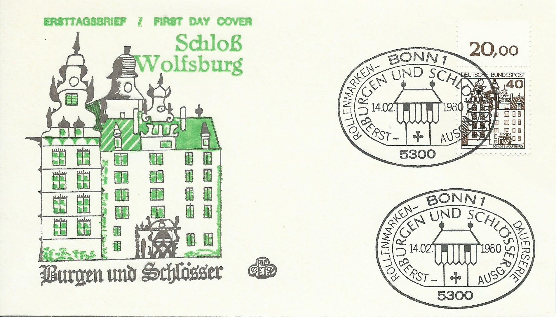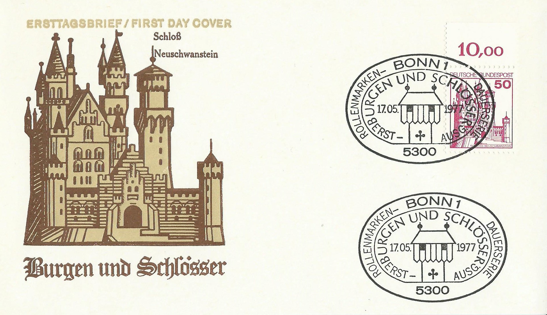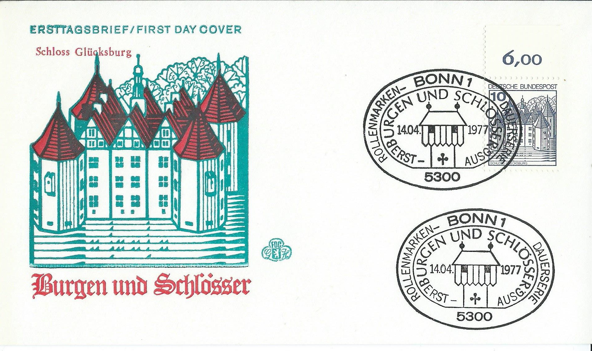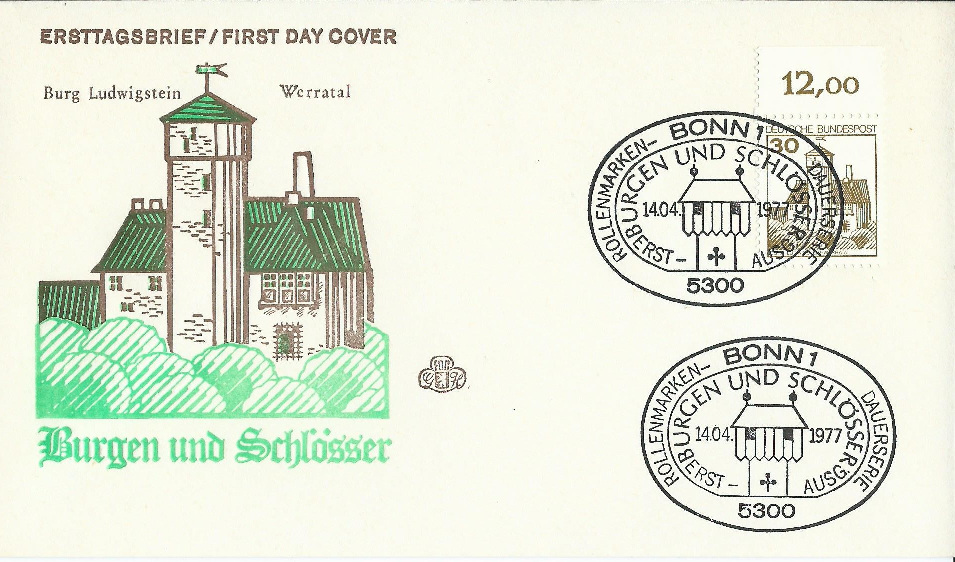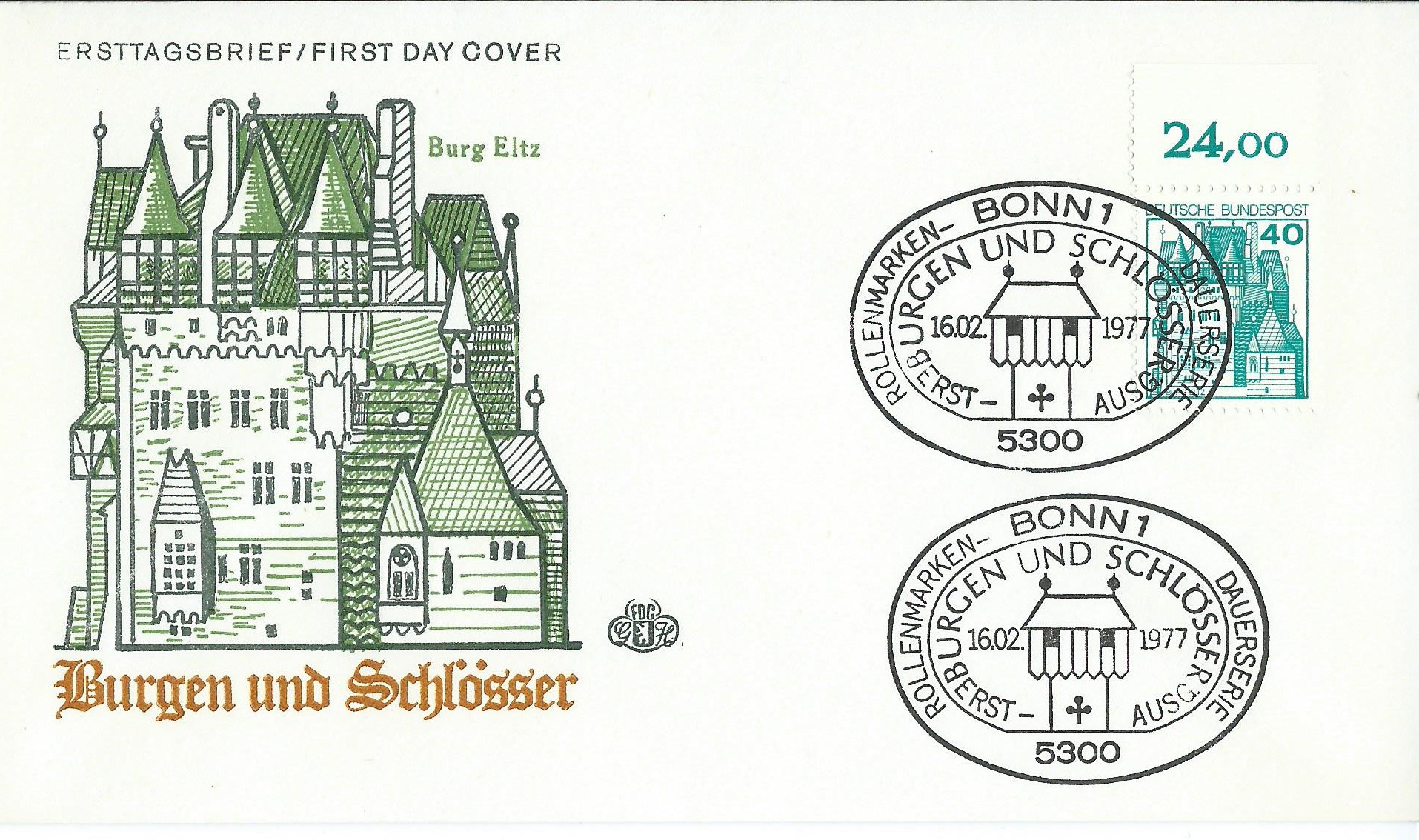 die Serie Burgen und Schlösser habe ich einmal komplett als Ersttagsbrief erhalten können. Nun ist es ja leider mittlerweile so, dass einem „normale“ Ersttagsbriefe „hinterher geworfen“ werden. Meine hingegen haben alle Marken vom Oberrand und so etwas muss auch erst einmal gefunden werden.