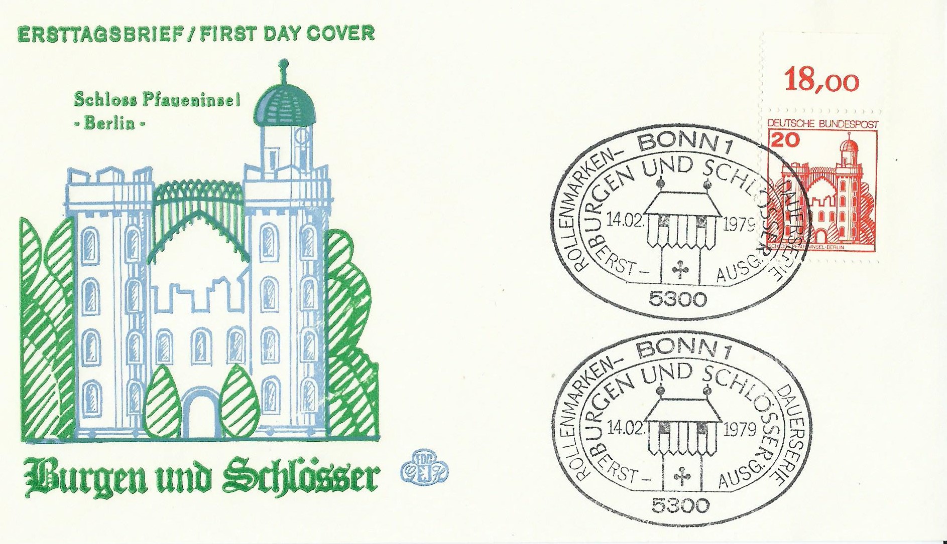 Gefolgt vom Wert zu 20 Pf vom Oberrand mit Reihenwertzähler 18,00 und Ersttagssonderstempel Bonn vom 14.02.1979: