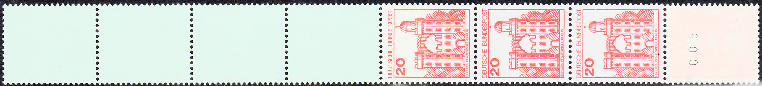20Pf-Wert der DS Burgen und Schlösser als Rollende mit fünf Marken + vier Leerfelder in helltürkis (MiNr 995 RE 5+4 Lf).