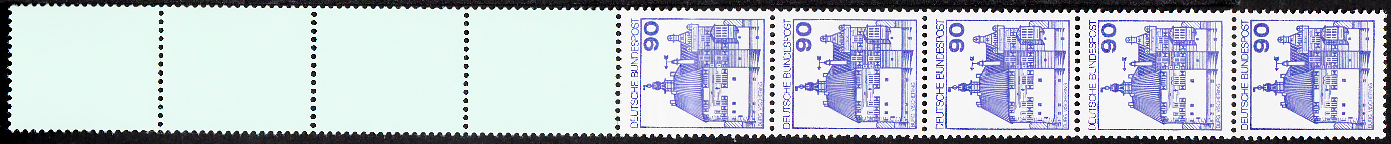 90Pf-Wert der DS Burgen und Schlösser als Rollende mit fünf Marken + vier Leerfelder in helltürkis (MiNr 997 RE 5+4 Lf).