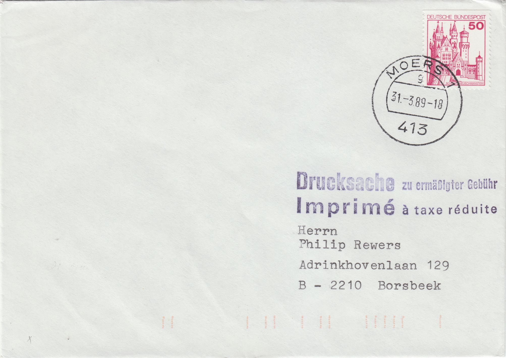 Dieser Beleg dokumentiert den 31.03.1989 als Letzttag der Portostufe 50 Pfennig für eine "Drucksache zu ermäßigter Gebühr":