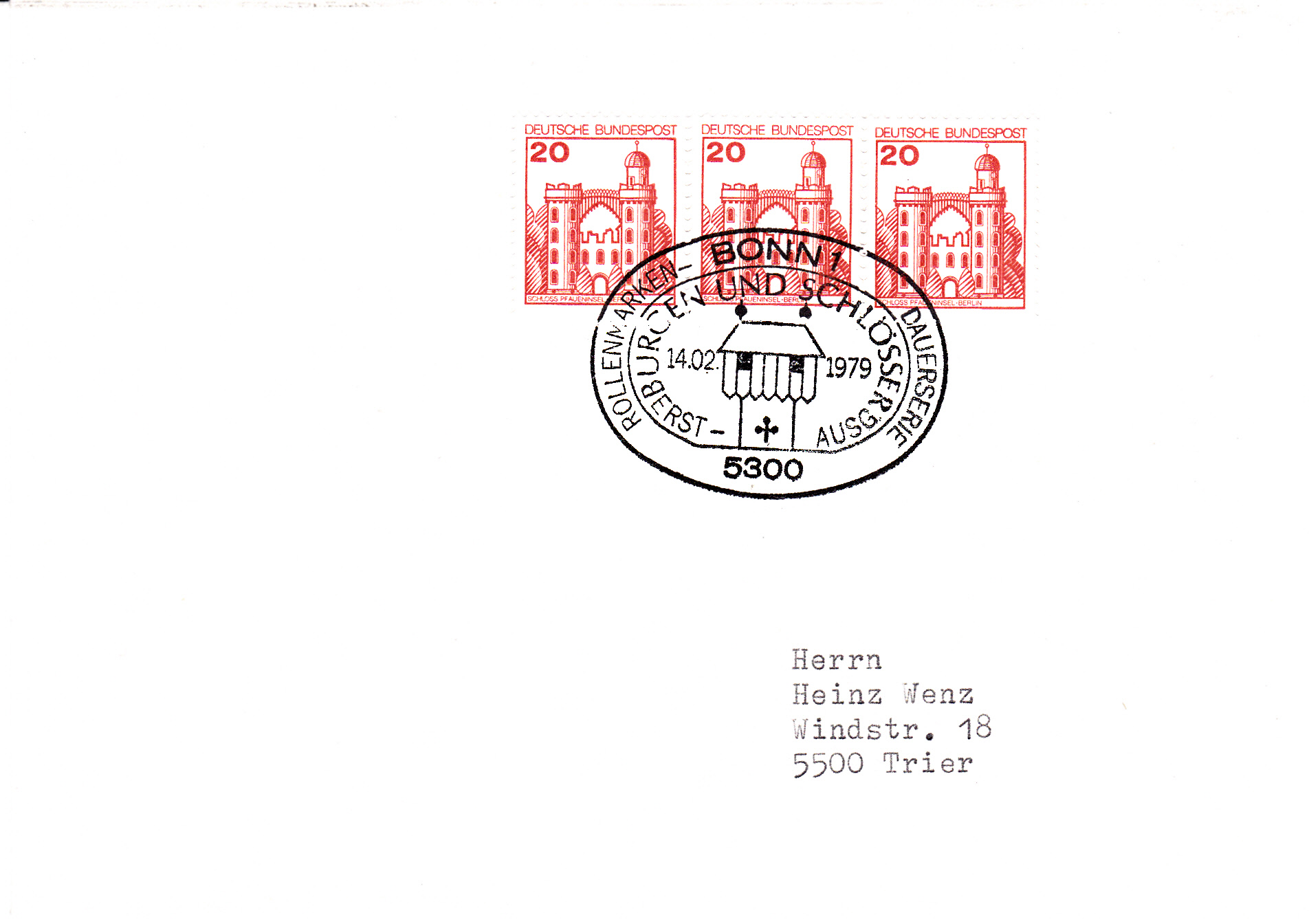 Waagerechter Dreierstreifen aus Bogen der 20 Pfennigmarke (MiNr 995) portogerecht auf einem Ersttagsbrief mit Ersttagsonderstempel Bonn vom 14.02.1979