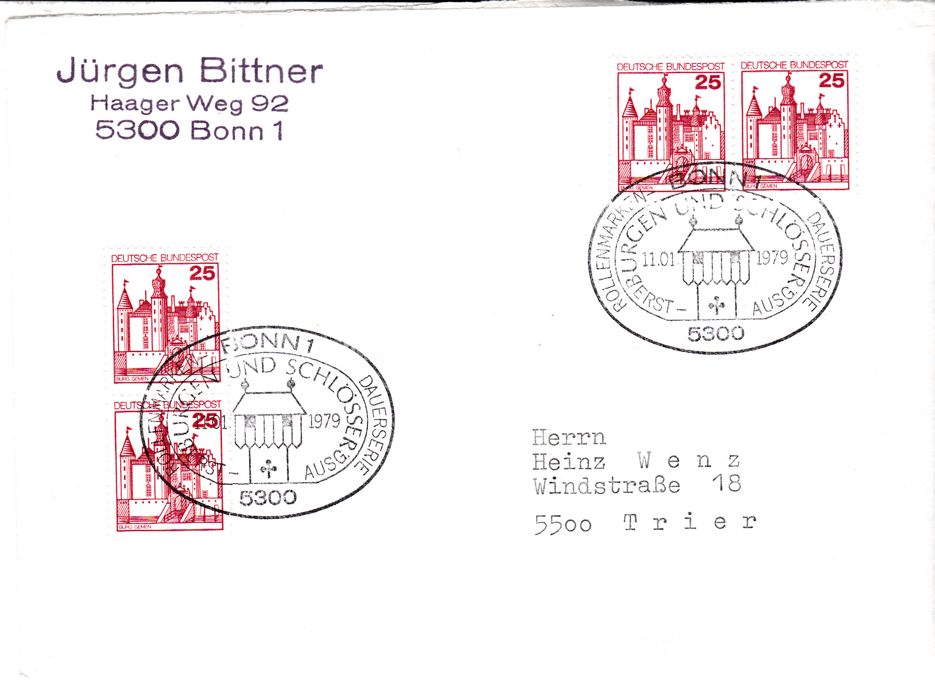 Waagerechtes Paar aus Bogen und senkrechtes Paar aus der Rolle der 25 Pfennigmarke (MiNr 996) portogerecht auf einem Ersttagsbrief von 21 bis 50 Gramm mit dem Ersttagsonderstempel Bonn vom 11.01.1979.