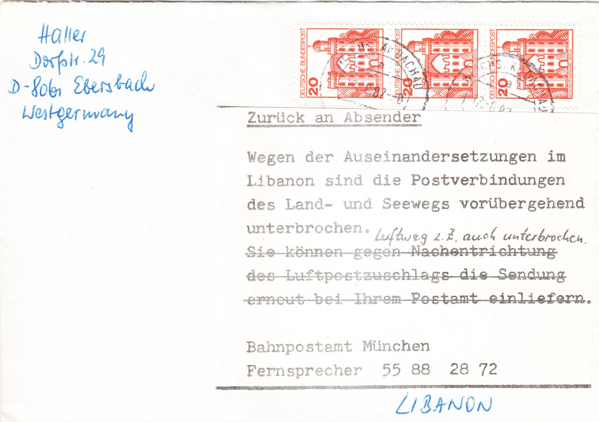 MeF von 6 Stück der Wertstufe zu 20 Pfennig am 12.08.1982 portorichtig auf Brief in den Libanon, der laut Klebezettel vom Bahnpostamt München aufgrund der wegen des Libanonkrieges erfolgten Unterbrechung der Postverbindung an den Absender zurück geleitet wurde.