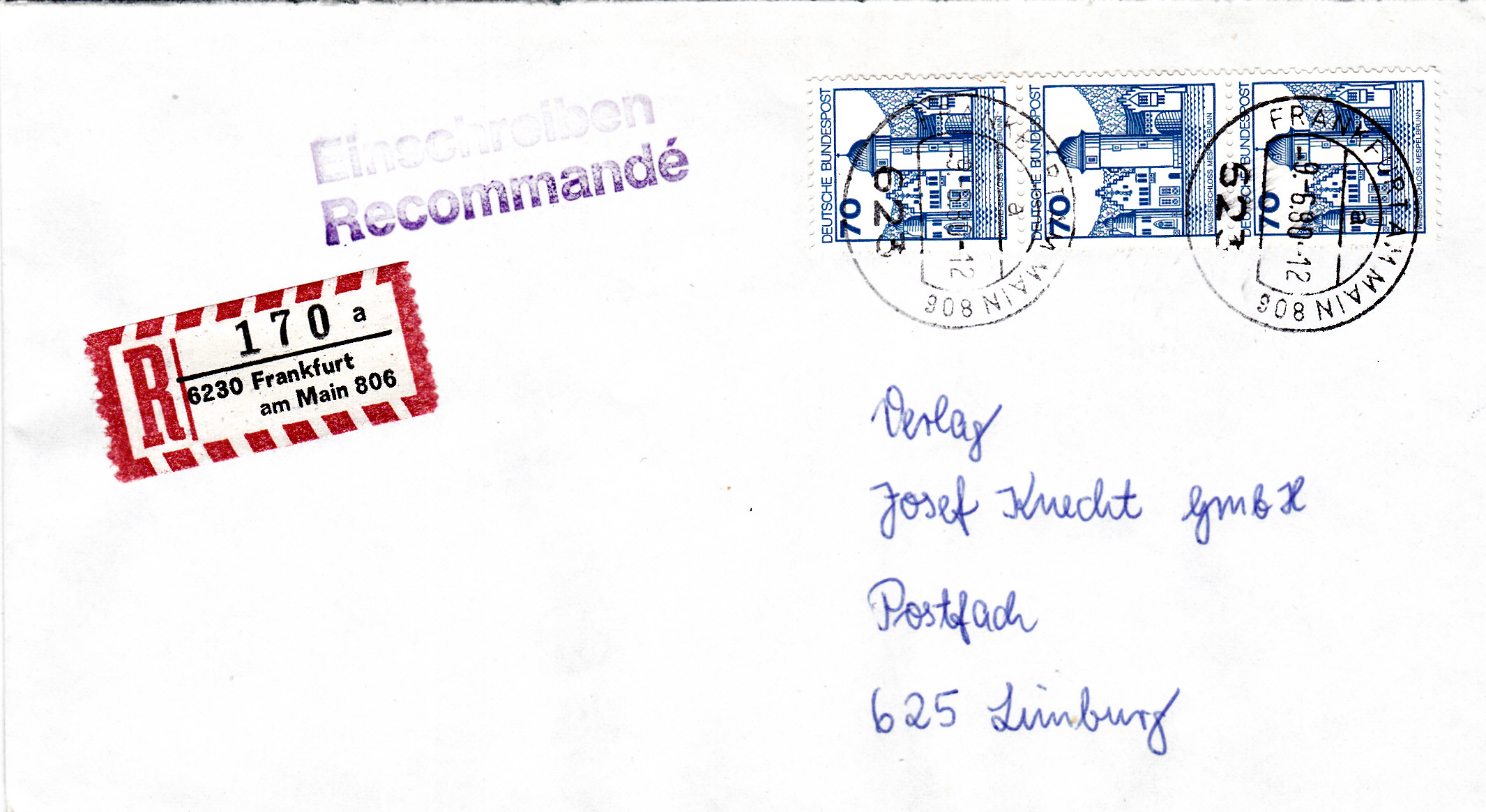 Mehrfachfrankatur der 70Pf-Marke aus der Serie Burgen und Schlösser (MiNr 918) auf einem Brief bis 20 Gramm per Einschreiben von Frankfurt am Main nach Limburg vom 9.6.1980. Das Porto betrug: Brief bis 20 Gramm 60Pf, Sonderleistung Einschreiben 150Pf ergibt zusammen 210Pf.