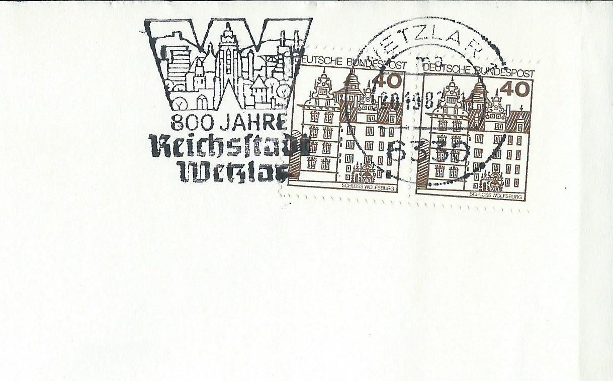 Dann habe ich ein waagerechtes Paar der Marke zu 40 Pf der 2. Ausgabe auf einem Briefstück. Hier wurde mit dem Maschinenstempel Wetzlar am 20.10.82 gestempelt.
