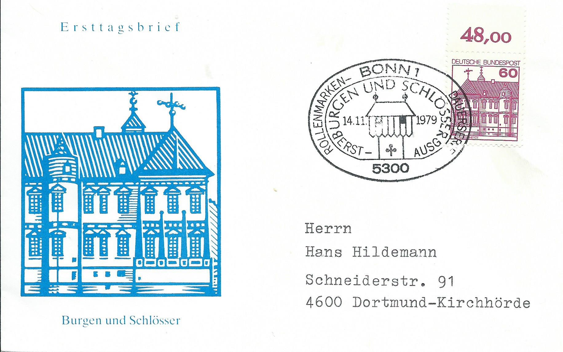 Ein Wert zu 60 Pf der 2. Ausgabe vom Oberrand mit Reihenwertzähler 48,00 auf einem Ersttagsbrief. Gestempelt wurde mit dem Ersttagssonderstempel Bonn vom 14.11.1979.