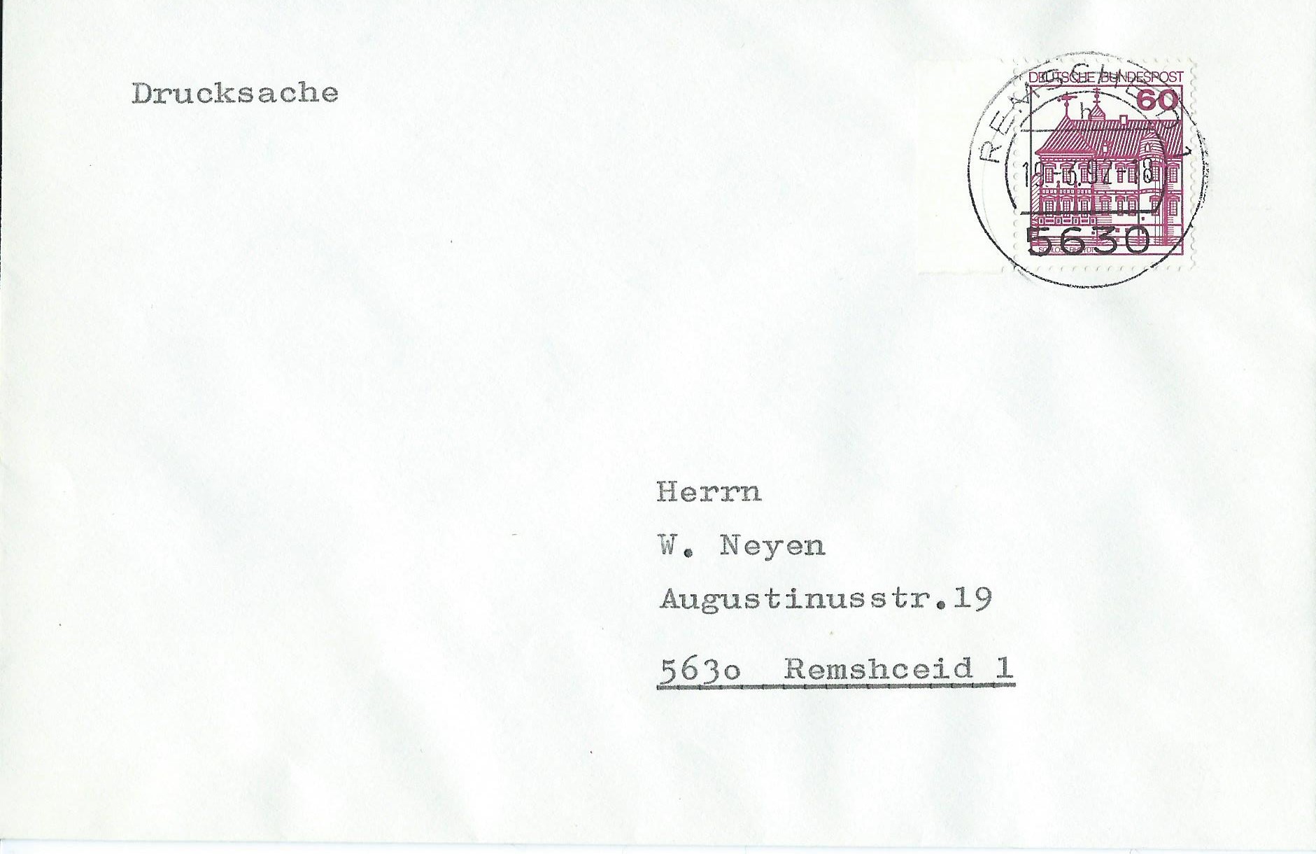 Dazu ein weiterer Wert zu 60 Pf Schloss Rheydt vom linken Seitenrand. Hiermit wurde eine Drucksache frankiert, die am 19.3.92 in Remscheid gestempelt wurde.