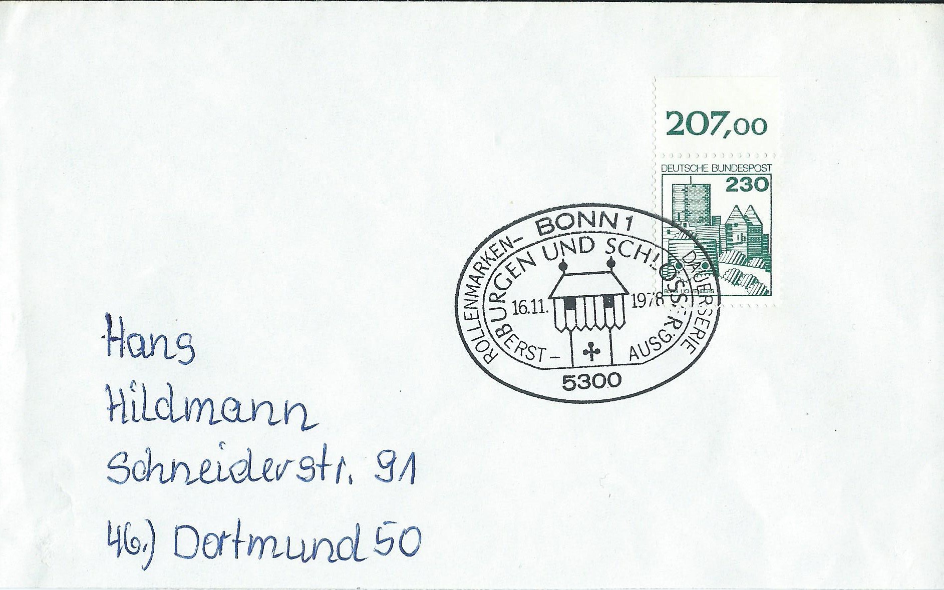 Und der letzte in dieser Runde ein Wert zu 230 Pf vom Oberrand mit Reihenwertzähler 207,00 auf einem Ersttagsbrief. Gestempelt wurde mit dem Ersttagssonderstempel Bonn vom 16.11.1978.