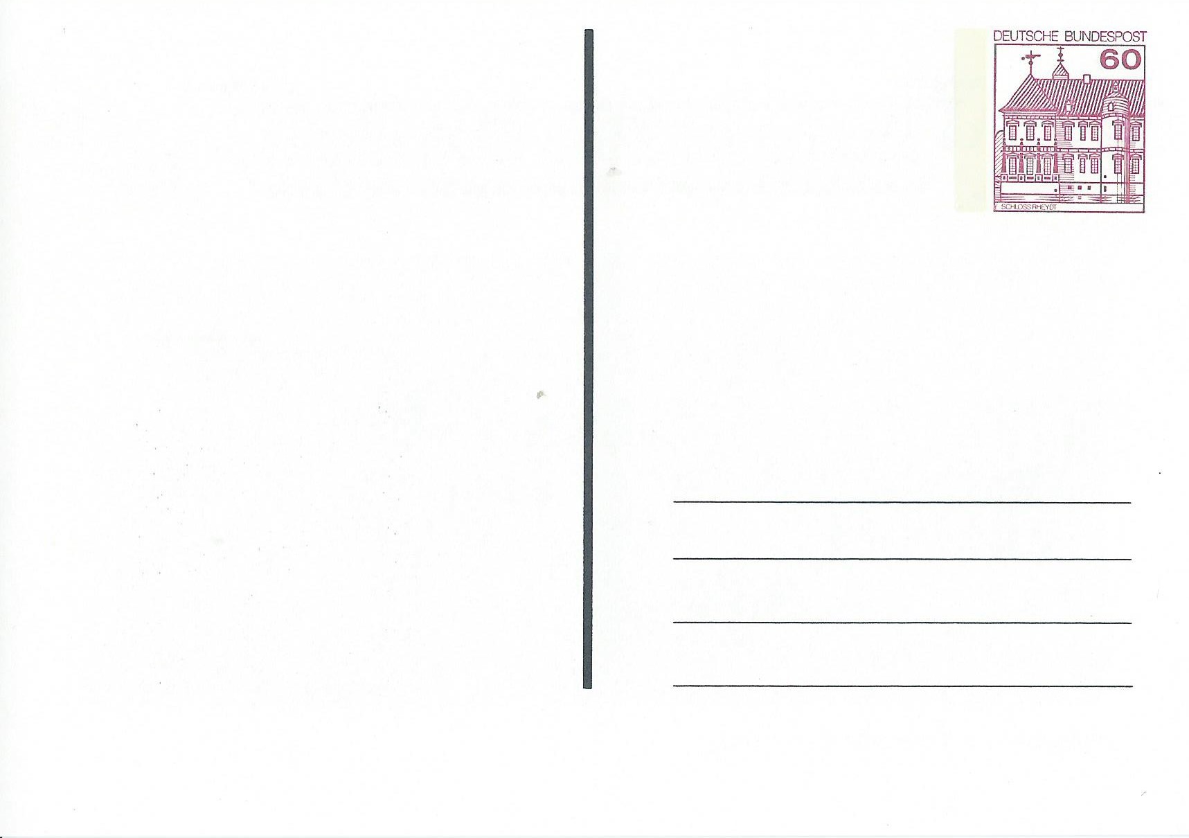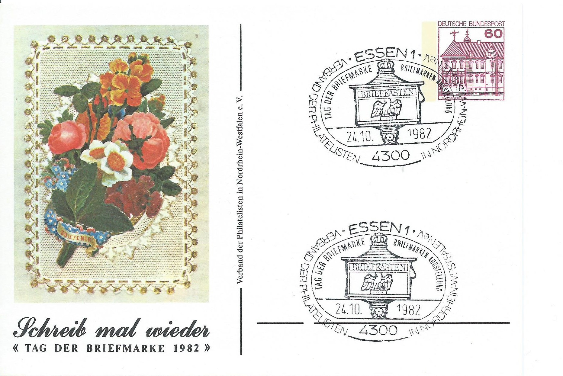 Den Anfang macht die Wertstufe zu 60 Pf Schloss Rheydt. Die hier gezeigte Privatganzsache als Postkarte wurde zum Tag der Briefmarke 1982 aufgelegt und in Essen am 24.10.82 mit dem entsprechenden Sonderstempel gestempelt.