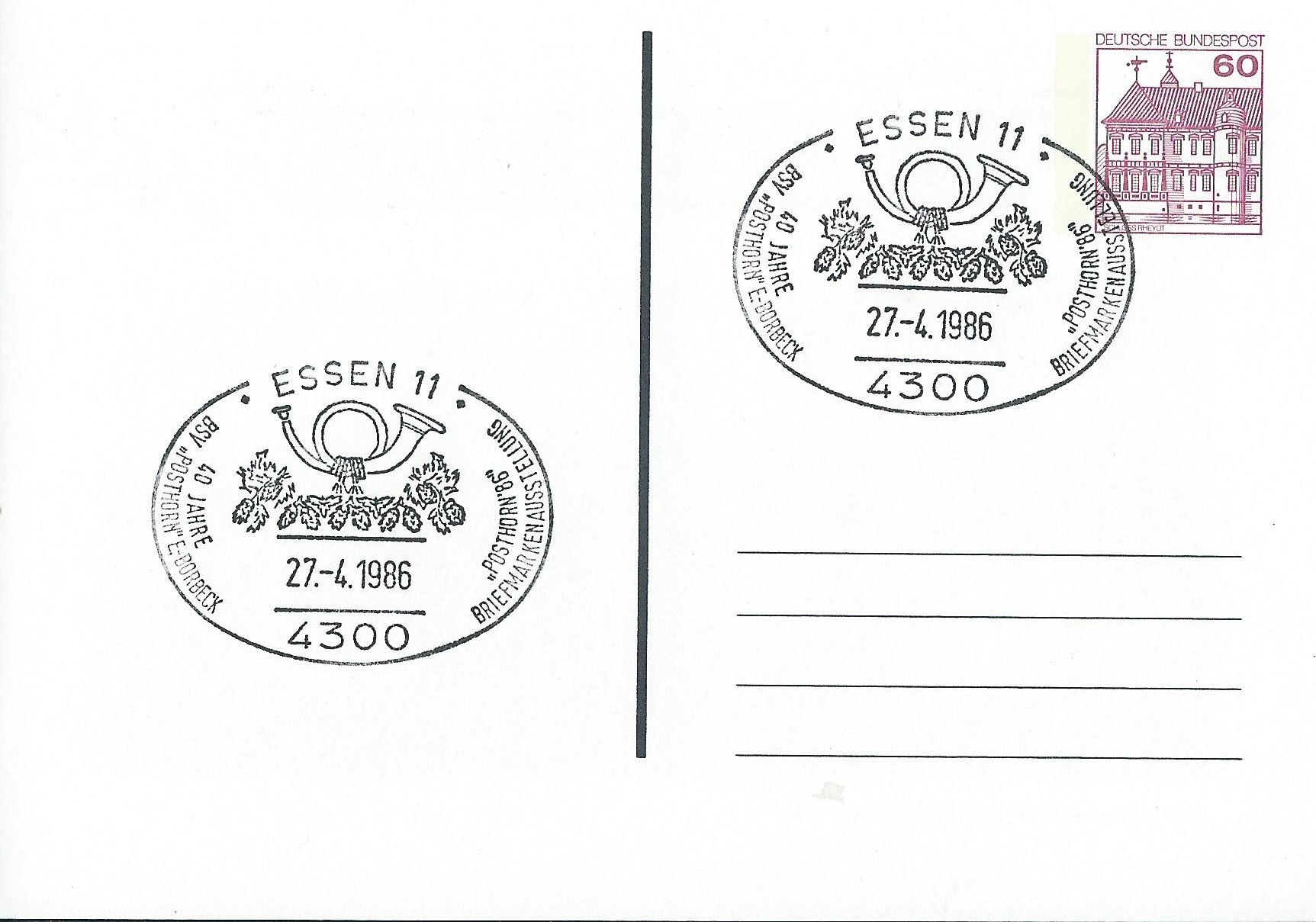 Eine weitere Postkarte mit gleichem Wertstempel legte der BSV „Posthorn“ in Essen – Borbeck zu seinem 40 jährigem Vereinsjubiläum auf. Gestempelt wurde die Ganzsache am 27.4.86 in Essen mit dem entsprechenden Sonderstempel.