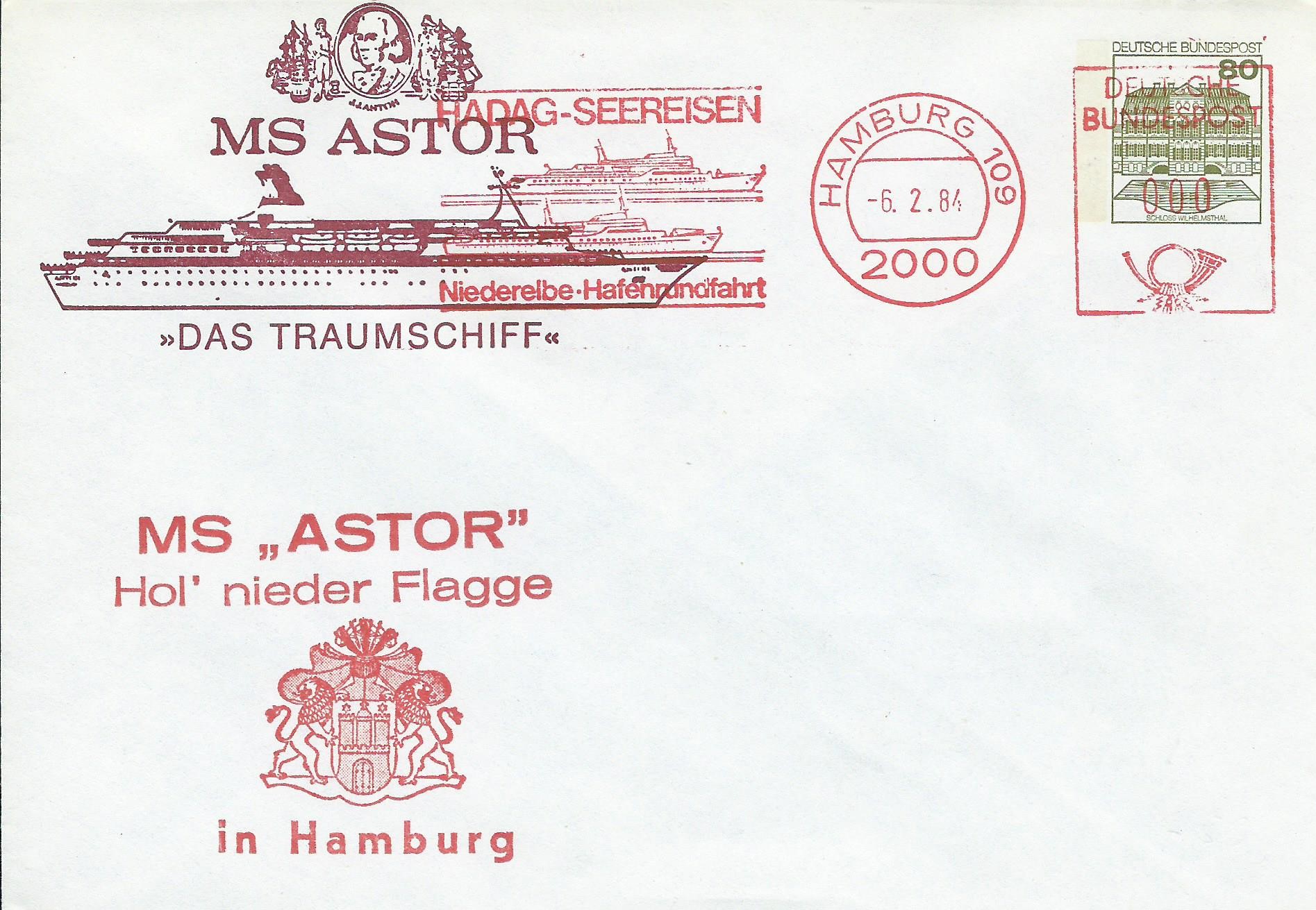 Der Wertstempel zu 80 Pf Schloss Wilhelmstal ist auf der nächsten Privatganzsache verwendet worden. Sie wurde von der HADAG-Reederei in Auftrag gegeben und hat als Schmuckzudruck die MS Astor sowie einen roten Zusatzstempel „MS-Astor Hol nieder Flagge“. „Entwertet“ wurde der Umschlag mit einem Firmenfreistempler der HADAG-Seereederei mit der Einstellung 000 am 6.2.84.