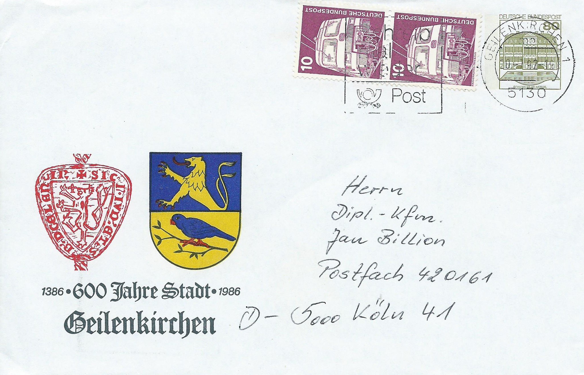 Und der letzte mir vorliegende Beleg wurde vom Philatelistenverein Geilenkirchen e. V. aufgelegt. Auch er trägt als Wertstempel die 80 Pf Schloss Wilhelmstal nebst Zusatzfrankatur zweier 10 Pf-Marken Industrie und Technik. Gestempelt wurde der Beleg am 20.1.92 in Geilenkirchen mit der Stempelmaschine.
