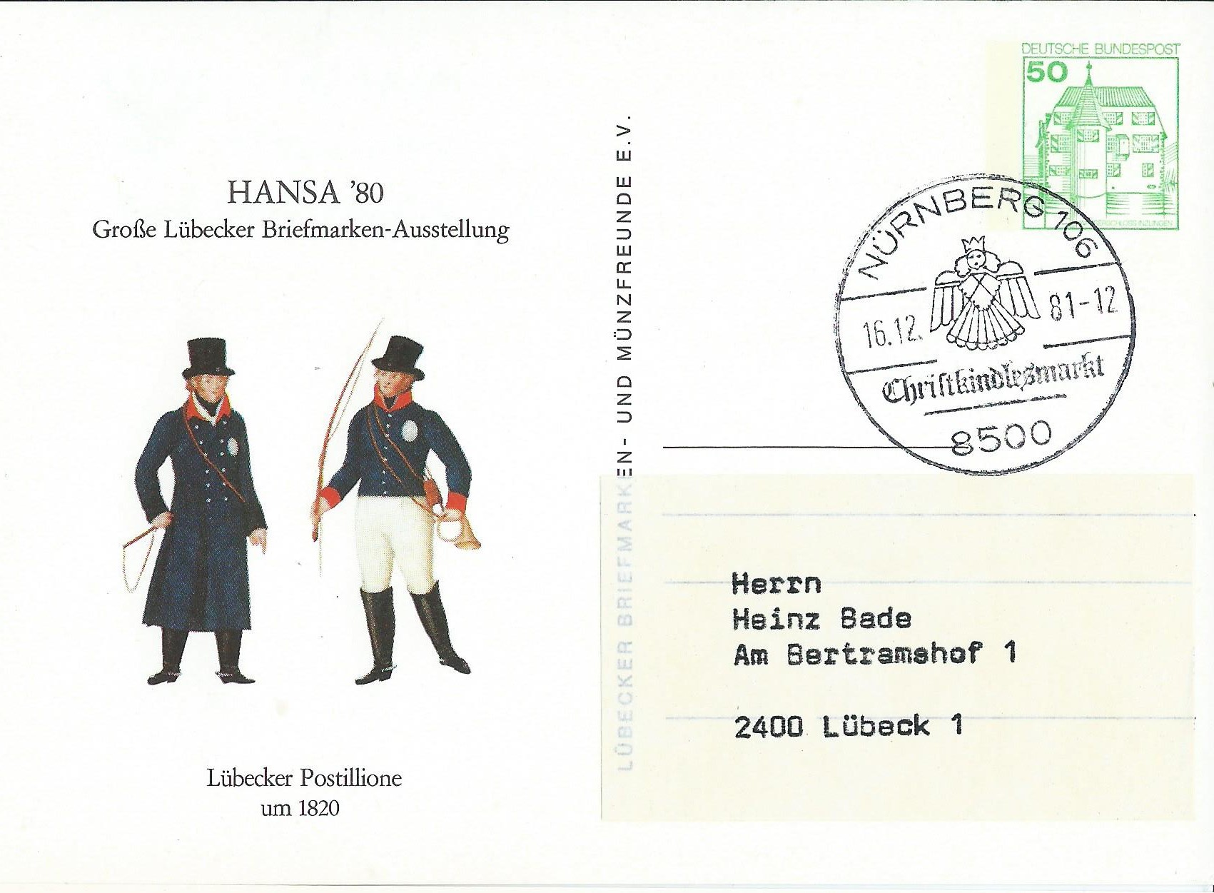 hier kommt eine Privatganzsache mit dem Wertstempel zu 50 Pf zur „HANSA´ 80, große Lübecker Briefmarkenausstellung“. Gestempelt wurde sie allerdings „einige Kilometer“ südlicher in Nürnberg mit einem Sonderstempel am 16.12.81: