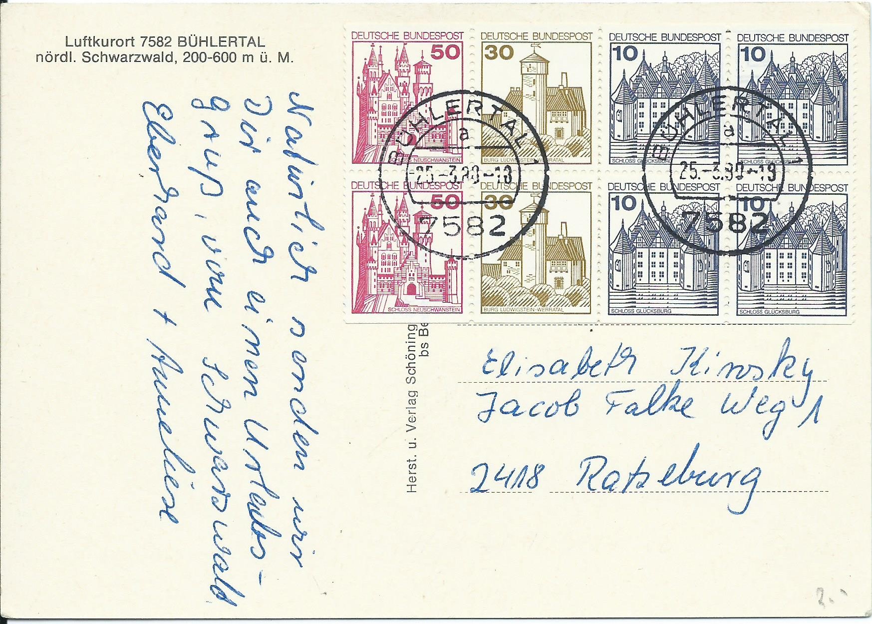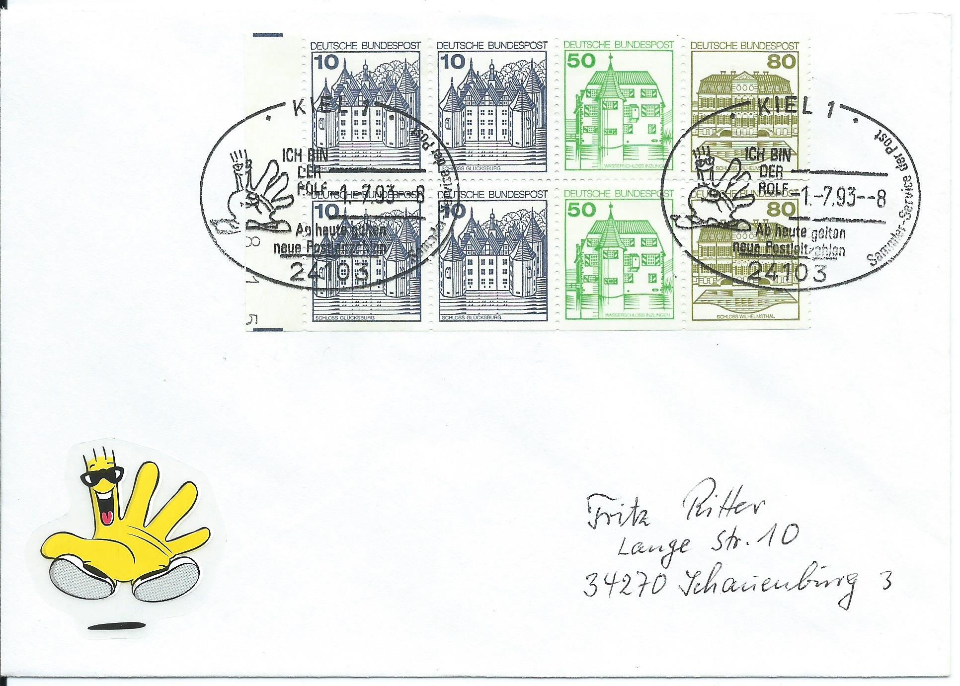Ein weiterer Beleg als Einschreiben aus dem damaligen „Verkehrsgebiet Ost“ (also ehemalige DDR) mit Zusatzfrankatur zur Portostufe 2,50 DM. Bis 31.3.91 waren dort noch andere (billigere) Portosätze als im „Verkehrsgebiet West“ gültig. Interessant ist bei diesem Beleg der Einschreibzettel. Im Postamt 7962 Dahme waren keine eigenen Einschreibzettel mehr vorhanden, da mussten welche aus einem anderen Postamt aushelfen: 1085 Berlin ZPF. Der Aufdruck wurde durchgestrichen und mit einem blauen Postamtsstempel die richtige Bezeichnung aufgestempelt. Not macht erfinderisch!