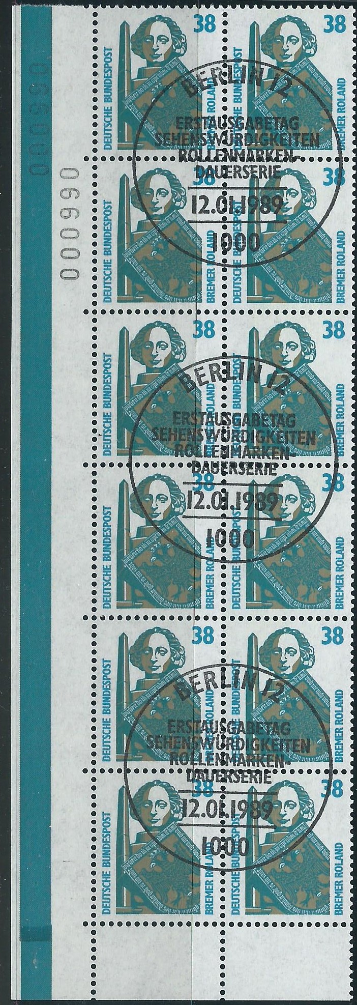 Dazu ein senkrechter 12-er-Block der Marke zu 38 Pf, ebenfalls vom linken Bogenrand von der unteren Ecke an aufwärts. Gestempelt wurde auch hier mit dem Ersttagssonderstempel Berlin am 12.1.89. Das Besondere hieran sind wieder die beiden Bogenzählnummern im Farbrand und weißen Untergrund sowie links unten die Überlappung im Farbrand.