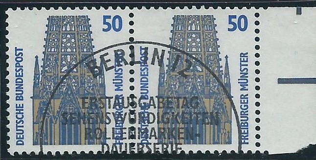 Dann geht es etwas unspektakulär weiter mit einem waagerechten Paar der Marke zu 50 Pf vom rechten Seitenrand und Ersttagssonderstempel von Berlin 12. Im Seitenrand ist oben noch ein Fragment der Formnummer 1 zusehen.