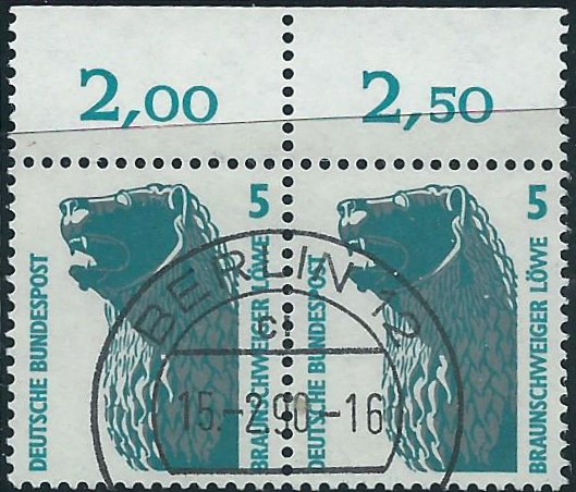 Und noch ein waagerechtes Paar zu 5 Pf vom Oberrand mit Reihenwertzählern, gestempelt in Berlin am 15.2.90: