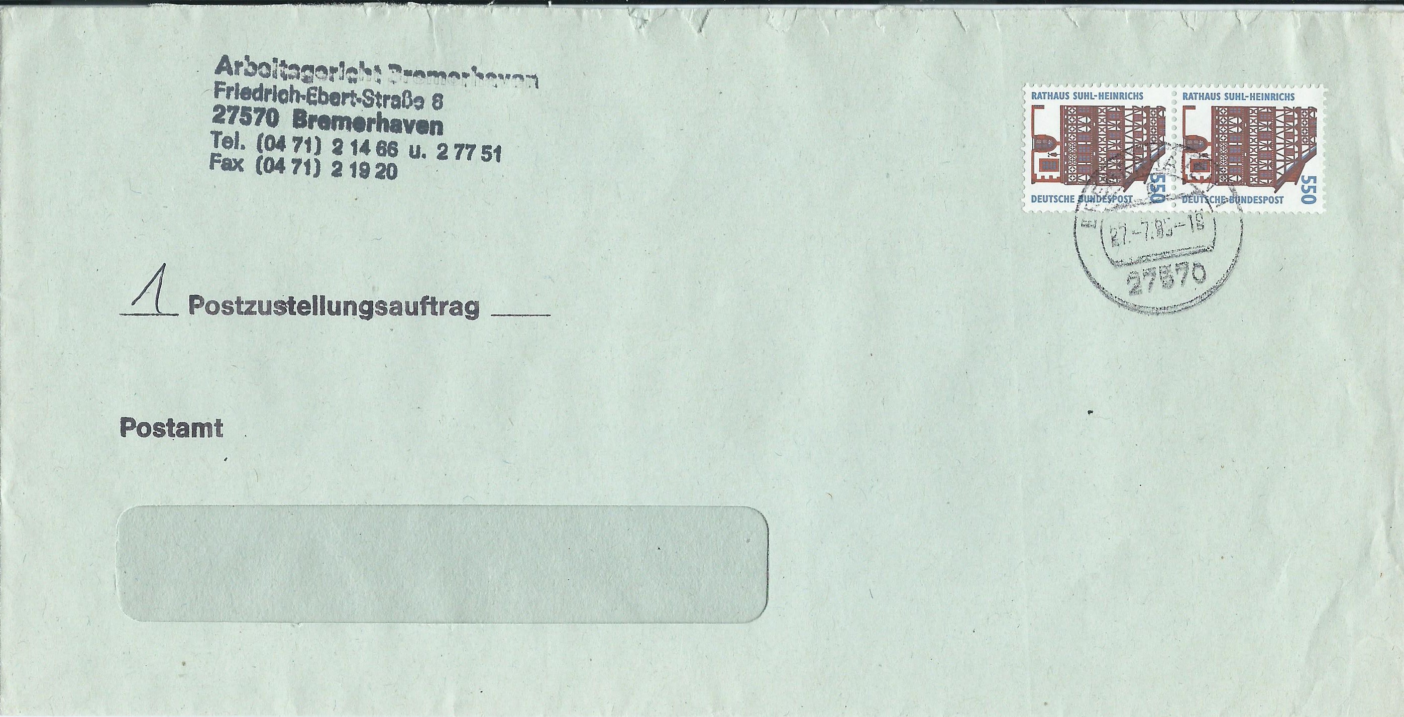 Der nächste wurde mit einem senkrechten Paar zu 550 Pf frankiert, gestempelt in Bremerhaven am 27.7.95: