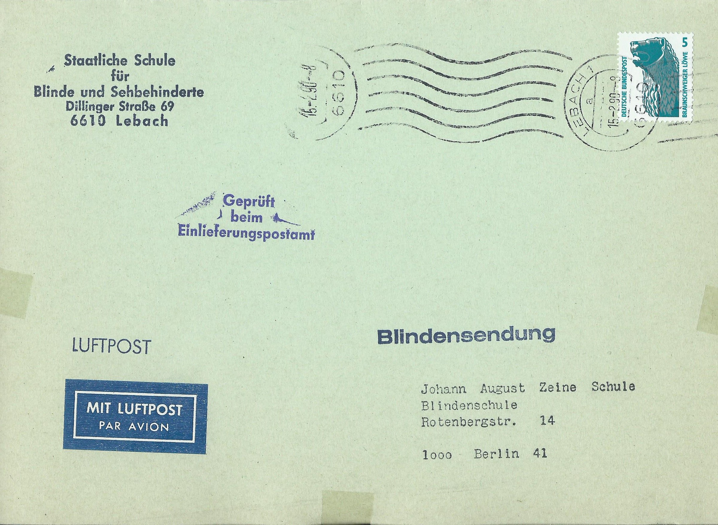 vor kurzem konnte ich eine Einzelfrankatur der Marke zu 5 Pf günstig erwerben. Von Messen, ebay und Tauschtagen war mir bekannt, dass solche Belege gerne mal 20 € aufwärts kosten und so habe ich mit 2,05 € wohl nichts falsch gemacht. Hier handelt es sich um eine an sich gebührenfreie Blindensendung, die per Luftpost verschickt wurde und nur der Luftpostzuschlag von 5 Pf frankiert werden musste. Somit haben wir eine portorichtige Einzelfrankatur vorliegen, Absender (in Lebach) und Empfänger (in Berlin) waren Schulen für Blinde. Gestempelt wurde in Lebach am 15.2.90.