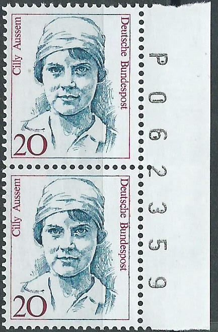 hier kann ich ein postfrisches senkrechtes Paar vom rechten Bogenrand zeigen, welches eine komplette Bogenzählnummer aufweist.