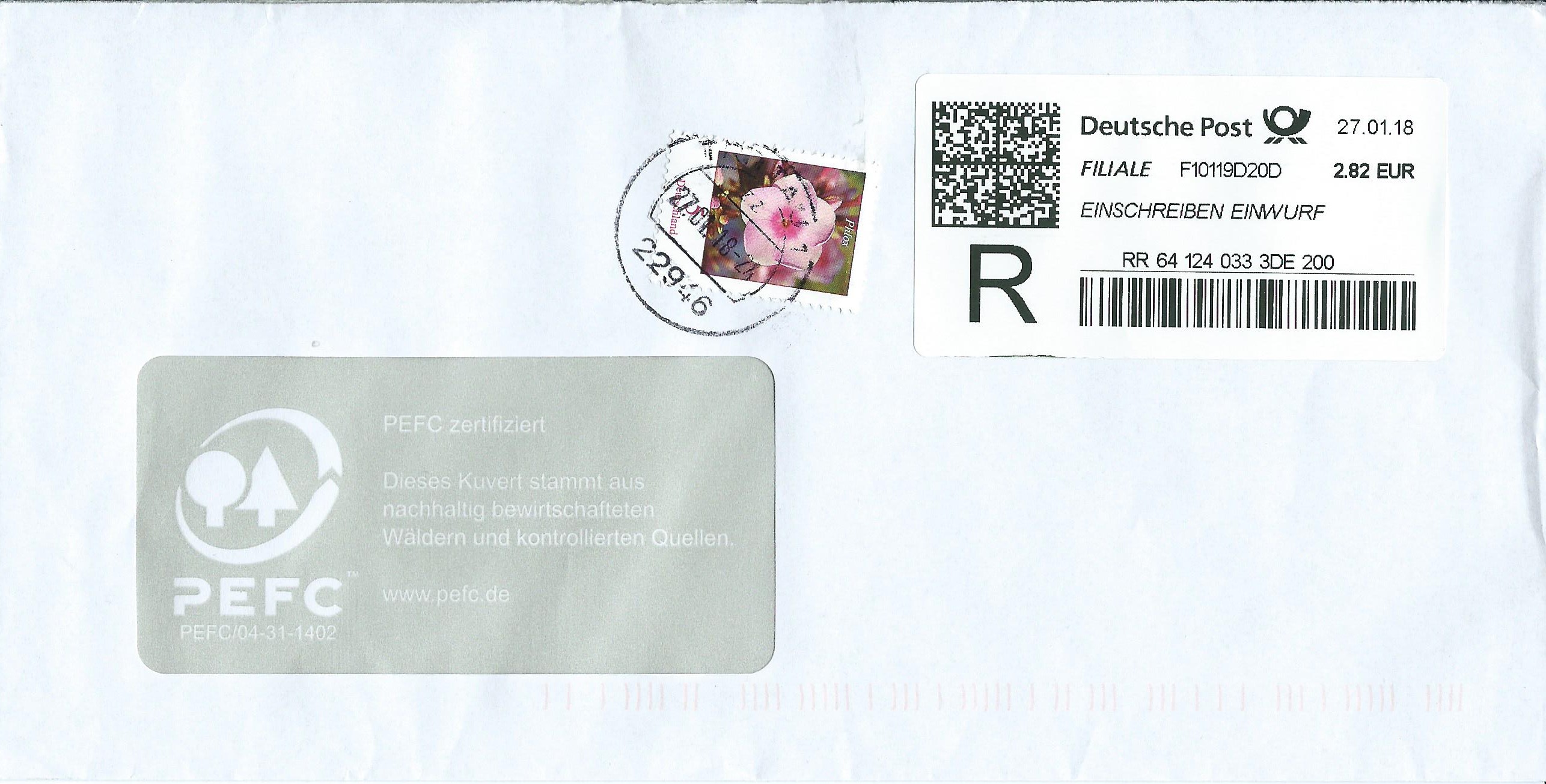 hier habe ich einmal ein Kuriosum zu zeigen. Auf den ersten Blick ist das ein ganz normaler Einschreib-Brief. Es war hier laut R-Label Einwurf-Einschreiben beauftragt worden. Ich habe den Beleg zuerst auch achtlos in eine Belege-Kiste gelegt, die ein Sammlerfreund von mir erhalten sollte, der solche Belege sammelt. Irgendwann habe ich dann aber doch noch einmal genauer hingesehen und festgestellt, dass hier eine komplett krumme Summe frankiert wurde. Auf dem Label stehen 2,82€ und dazu klebt noch die 5 ct-Blumenmarke. Also zusammen 2,87 €. Nun habe ich mich gefragt, was das denn für eine Portostufe sein kann. Ich kenne eigentlich nur den Portosatz 70 ct Standart-Brief plus 2,15 € für Einwurf-Einschreiben, also zusammen 2,85 €. Ein von mir befragter Postbediensteter konnte sich das nur so erklären, dass die Schalterkraft sich hier für das Label vertippt und später dann den Fehler bemerkt hat. Als Nachfrankatur hat sie dann die 5 ct-Marke genutzt und somit die Überfrankatur produziert. Ich habe diese Erklärung so erst mal hingenommen und nur angemerkt, warum sie dann nicht ein weiteres Label über die fehlenden 3 ct gedruckt habe anstatt die 5 ct-Marke zu verkleben. Genug Platz wäre ja noch gewesen. Darauf hat der Postler dann keine Erklärung mehr gehabt und war mit seinem Latein auch am Ende…