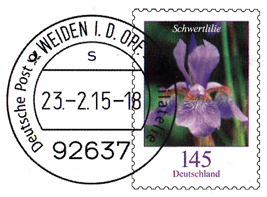 Dieser Ganzsachenumschlag im Format 229 x 162 mm hat einen Wertstempel mit der 145 Cent Marke "Schwertlilie" aus der Bauerserie "Blumen". Die Vorausentwertung hat das Datum "-9.-4.15-18". Es ist eine Eigenausgabe der Deutschen Post AG - Philatelie Weiden.