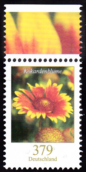 Ab 01.07.2018 kostet ein Päckchen S Deutschland bis 2 kg mit den Höchstabmessungen 35 x 25 x 10 cm 379 Cent. Dazu erschien am 12.72018 auch eine Marke zu 379 Cent in der Serie "Blumen" (MiNr 3399) mit der Abbildung einer Großblumigen Kokardenblume (Gaillardia grandiflora). Hier eine Marke aus dem Bogen, zu erkennen am Bogenrand.