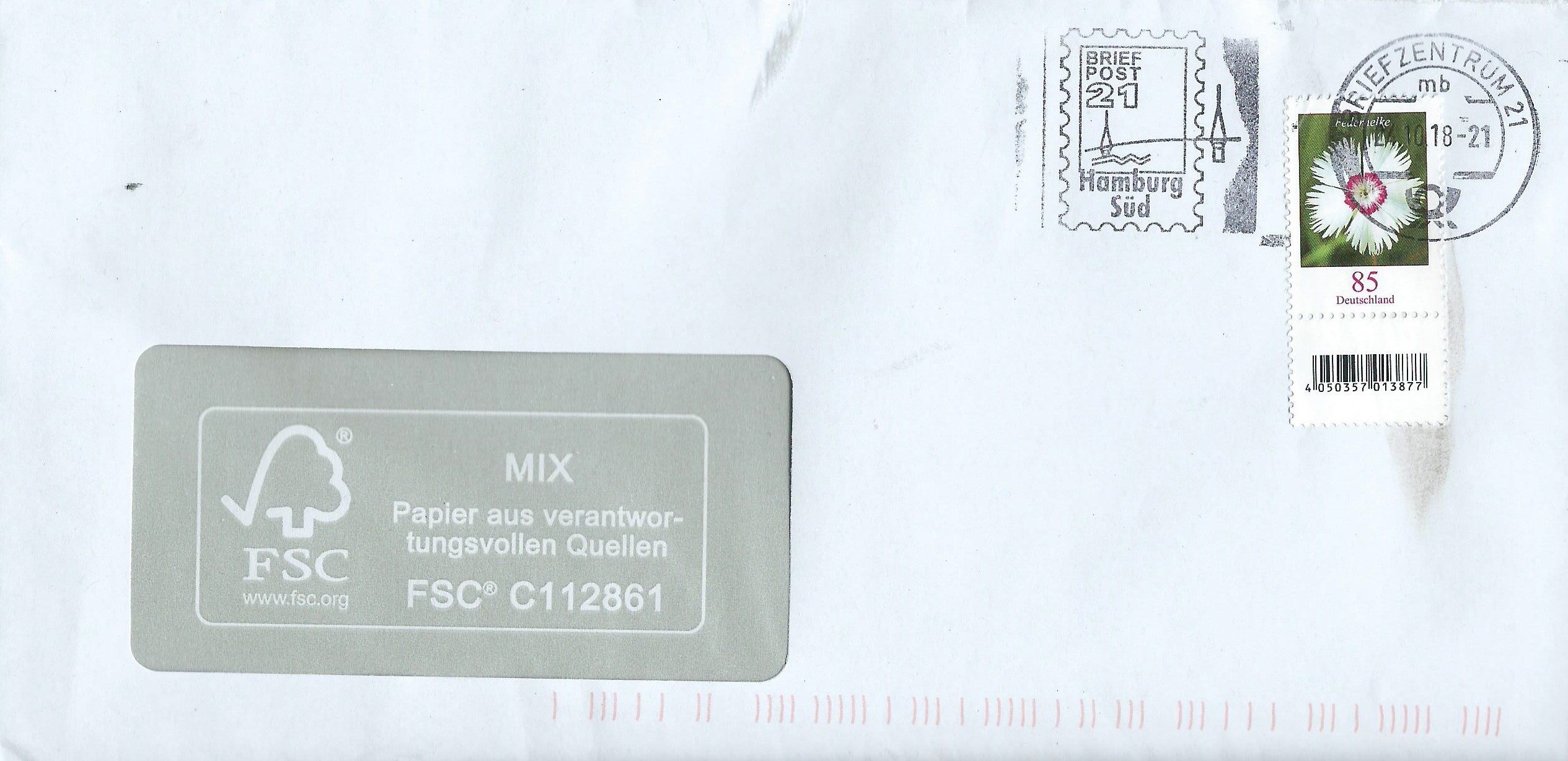 Einmal der Wert zu 70 ct mit der Nummer 4050357013853, rückseitig schimmert die Zählnummer 165 durch. Gestempelt wurde am 22.10.18 im Briefzentrum 23.