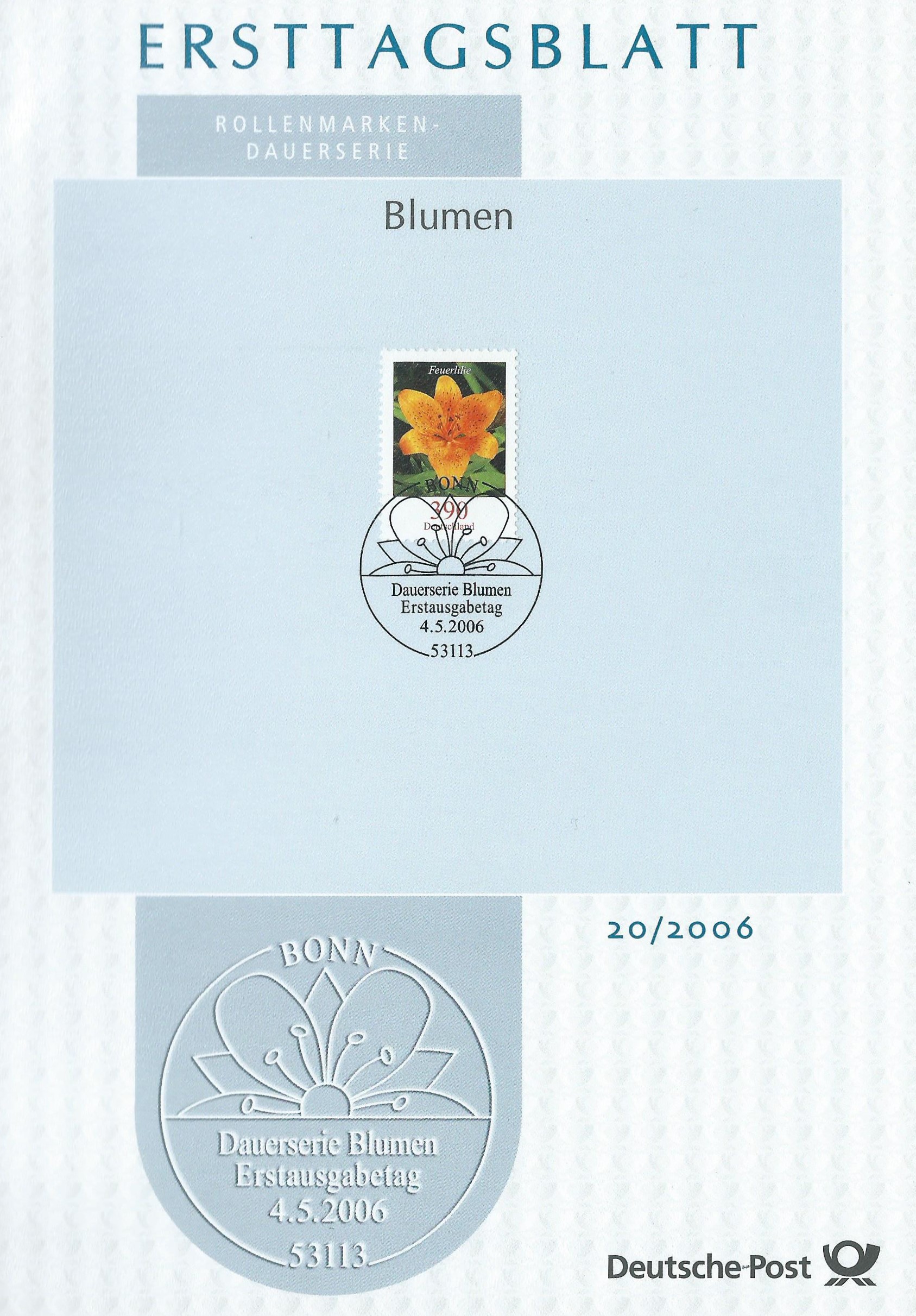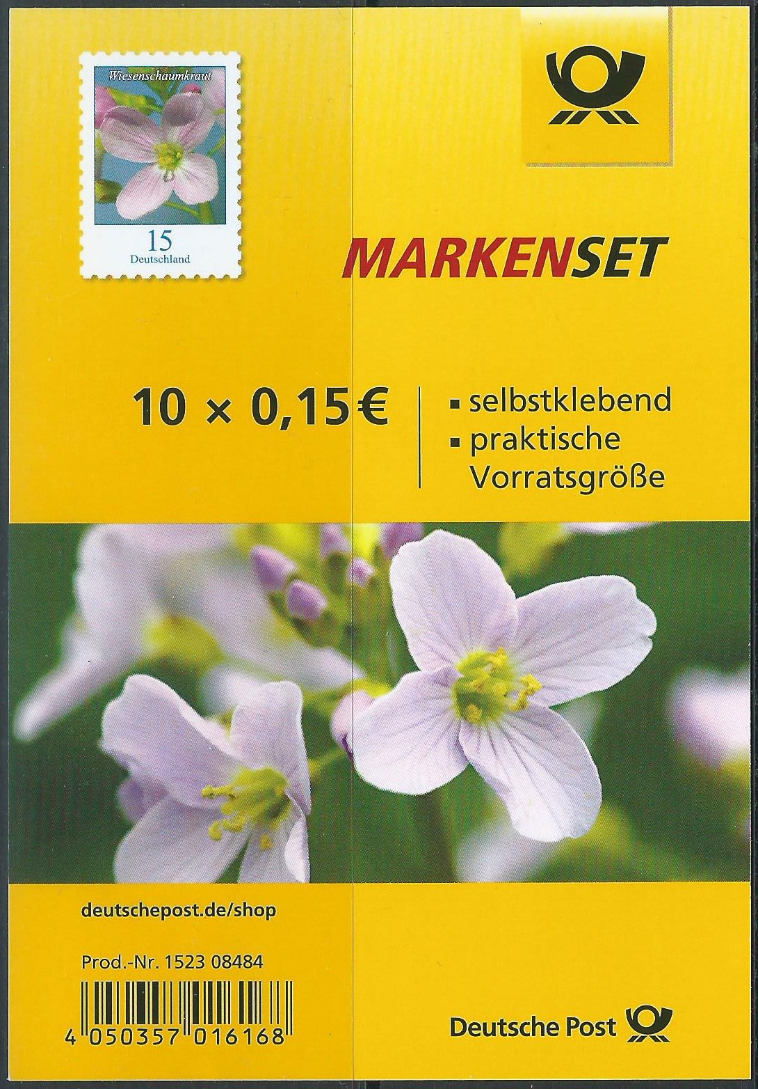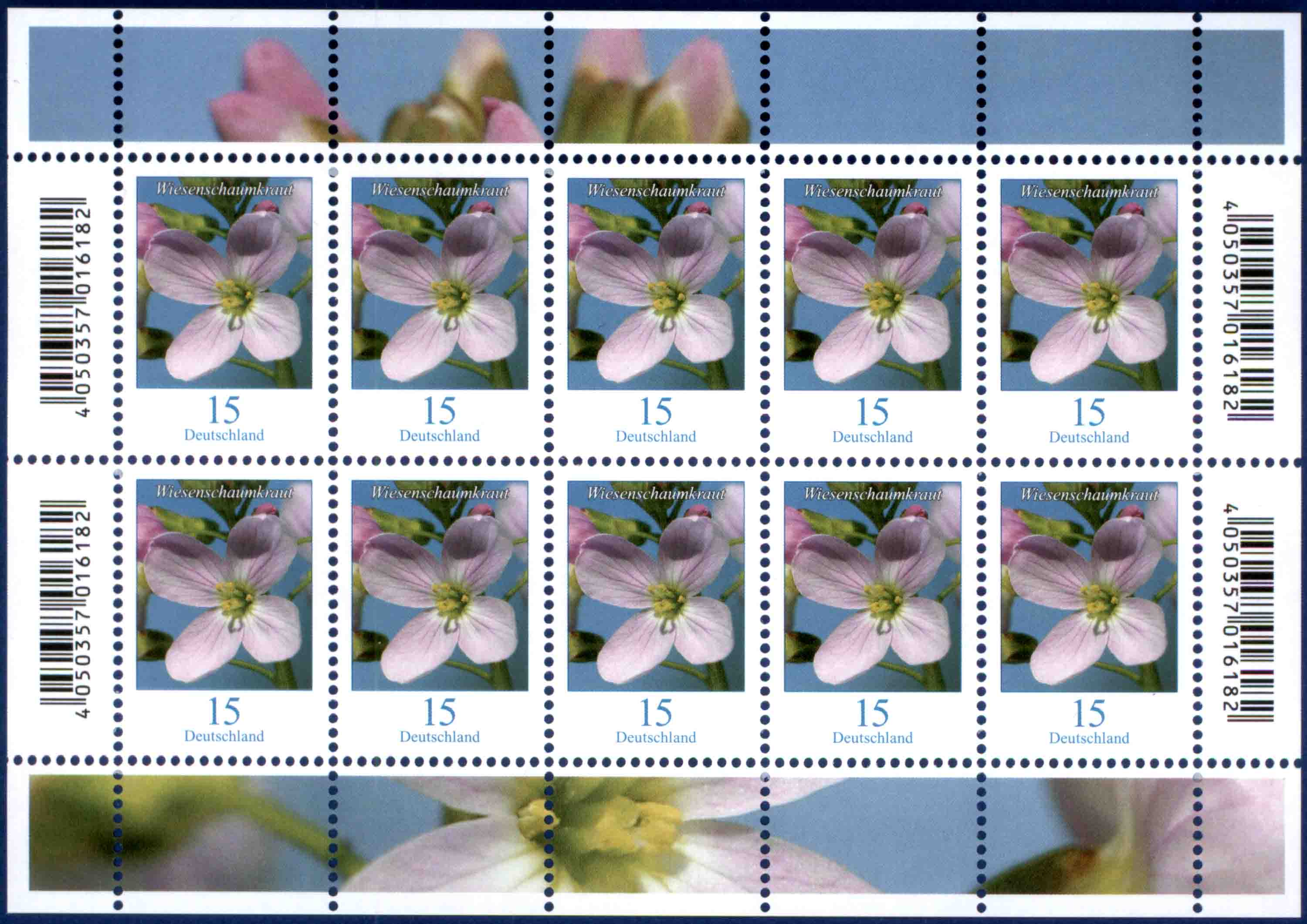 Hier nun der angekündigte Wert zu 15 Cent mit dem Motiv "Wiesenschaumkraut" (MiNr. 3424) im kompletten Zehnerbogen mit EAN-Code: