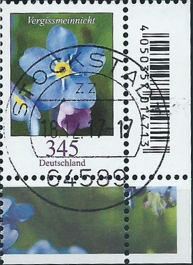 Es folgt das Vergissmeinnicht zu 345 Cent aus der rechten unteren Bogenecke mit Stempel Stockstadt vom 18.12.17: