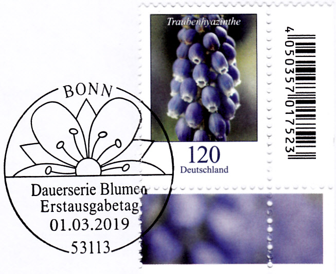 Seit 1.3.2019 gibt es eine Marke zu 120 Cent (MiNr 3447) mit der Abbildung "Traubenhyazinthe". Hier eine Marke vom Eckrand mit EAN-Codierung.