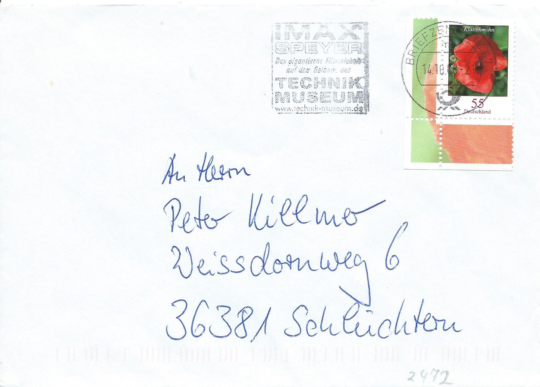 hier ein schönes linkes unteres Eckrandstück der Blumen-Marke zu 55 Cent Klatschmohn auf einem Standartbrief. Gestempelt wurde er am 14.10 08 im Briefzentrum 67.
