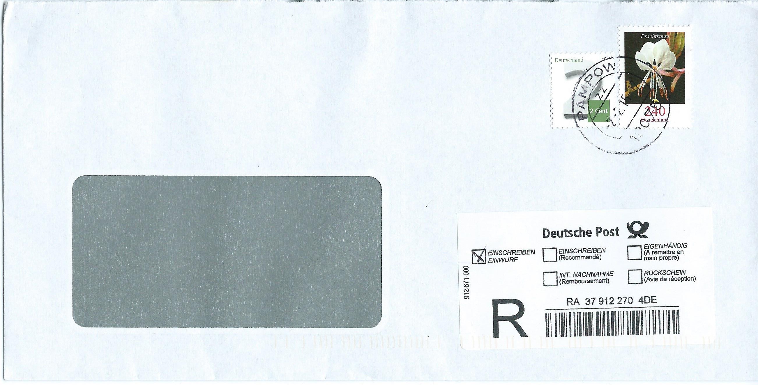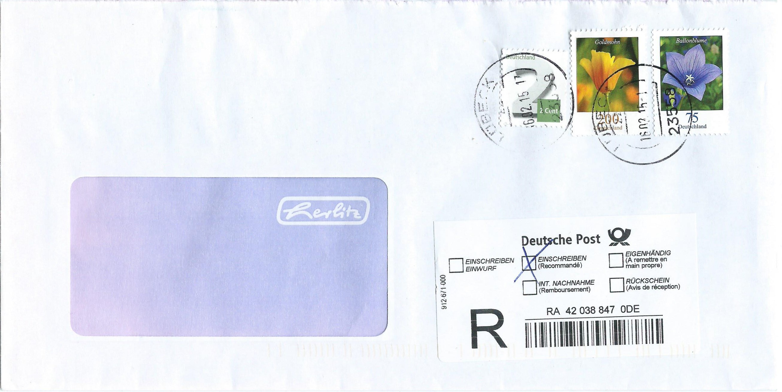 Nun eine Mischfrankatur: Je ein Blumenwert zu 75 und 200 ct sowie eine Ergänzungsmarke 2 ct auf Einschreiben. Hier stimmt wieder das Porto, 62 ct für den Brief und 215 ct Einschreibgebühr machen zusammen 275 ct, die hier verklebt sind. Stempel der Postagentur 23558 Lübeck vom 16.2.15.