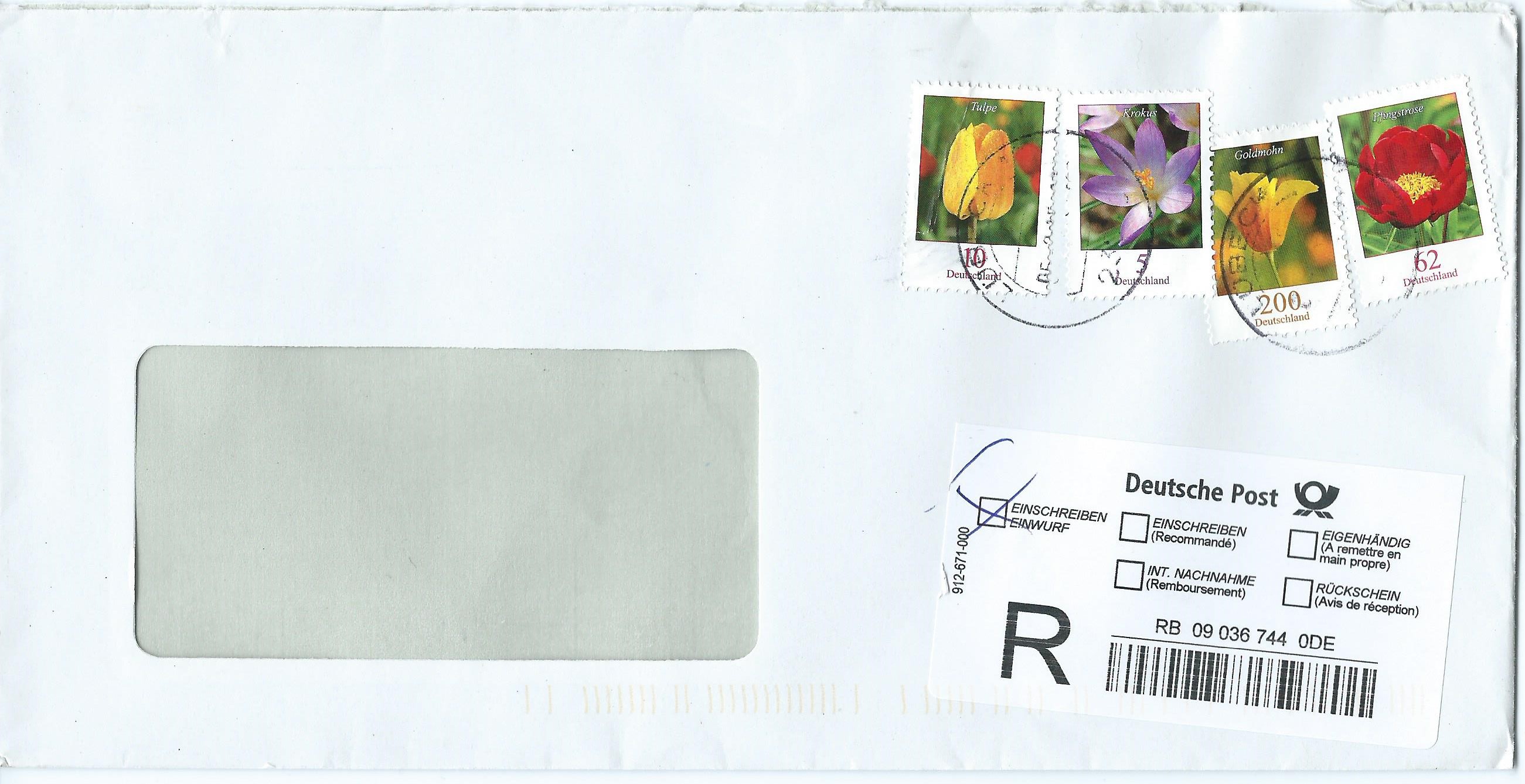 Ein richtig bunter Strauss Blumen: Je eine zu 5, 10, 62 und 200 ct, zusammen 2,77 ct für ein Einschreiben. Entwertet mit (leider schlecht lesbarem) Tagesstempel Lübeck vom 5.2.15.