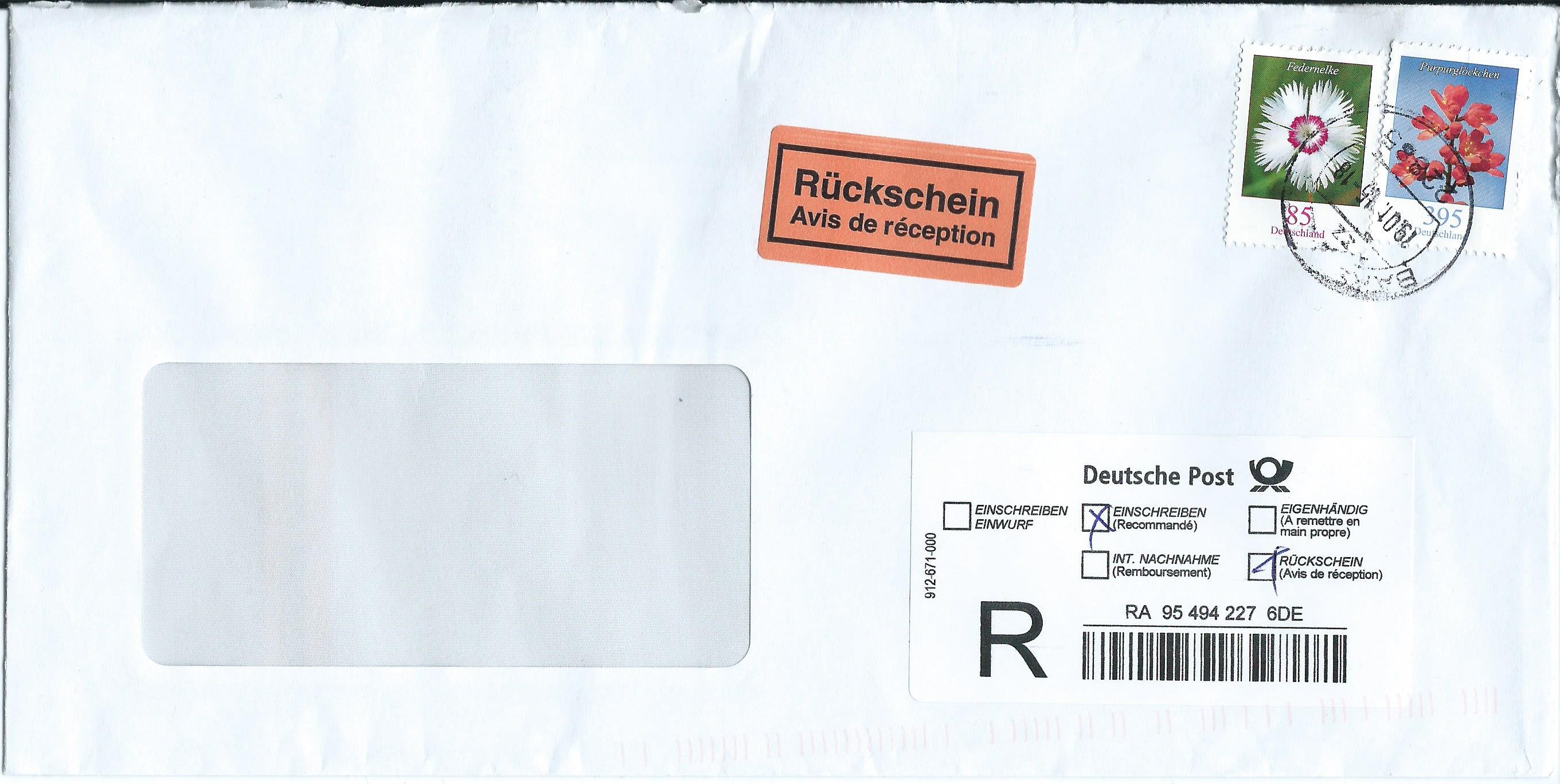 Und noch mal ein hoher Wert: 395 ct zusammen mit 85 ct auf Übergabe-Einschreiben mit Rückschein. Entwertet mit Tagesstempel von Barsbüttel (über die PLZ identifiziert) vom 19.1.15.