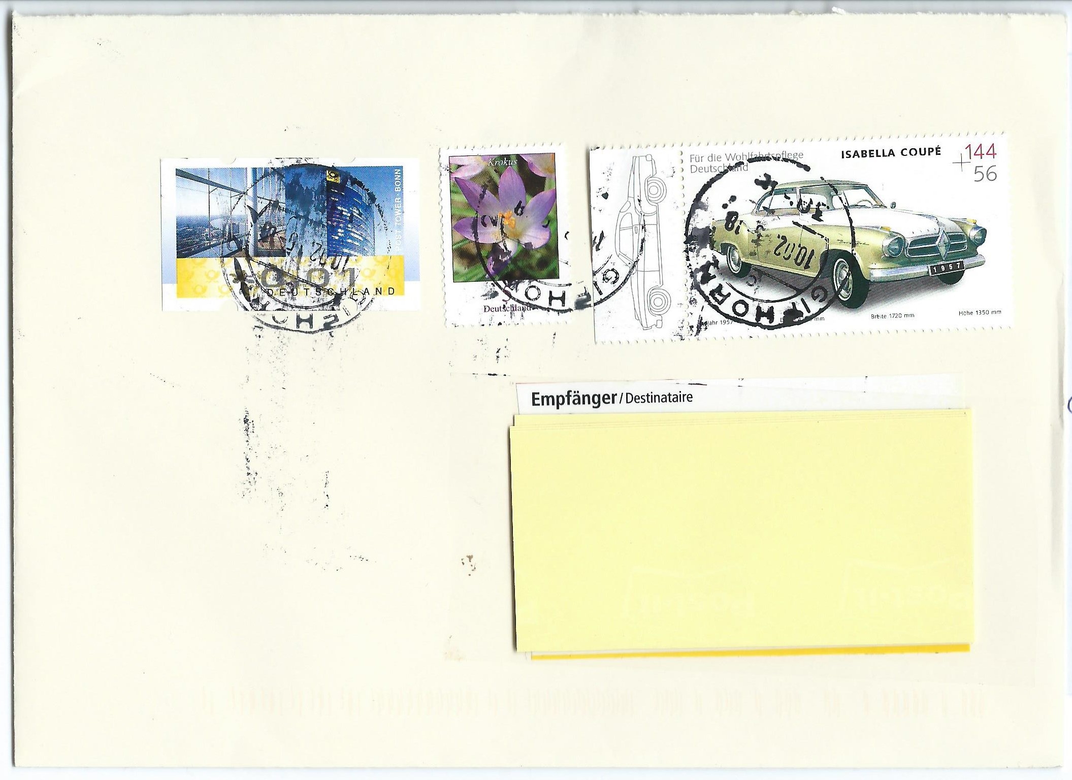 Gefolgt von einem Übergabe-Einschreiben mit je einer Blume zu 200 und 75 ct sowie einer Ergänzungsmarke 2 ct, gesamt 2,77 ct. (Mal aufgedröselt: Normalbrief 62 ct, dazu Einschreiben 215 ct, macht eine Portostufe von 2,77, krummer geht wohl kaum noch :D ) Entwertet mit Maschinenstempel Briefzentrum 23 vom 3.2.15.